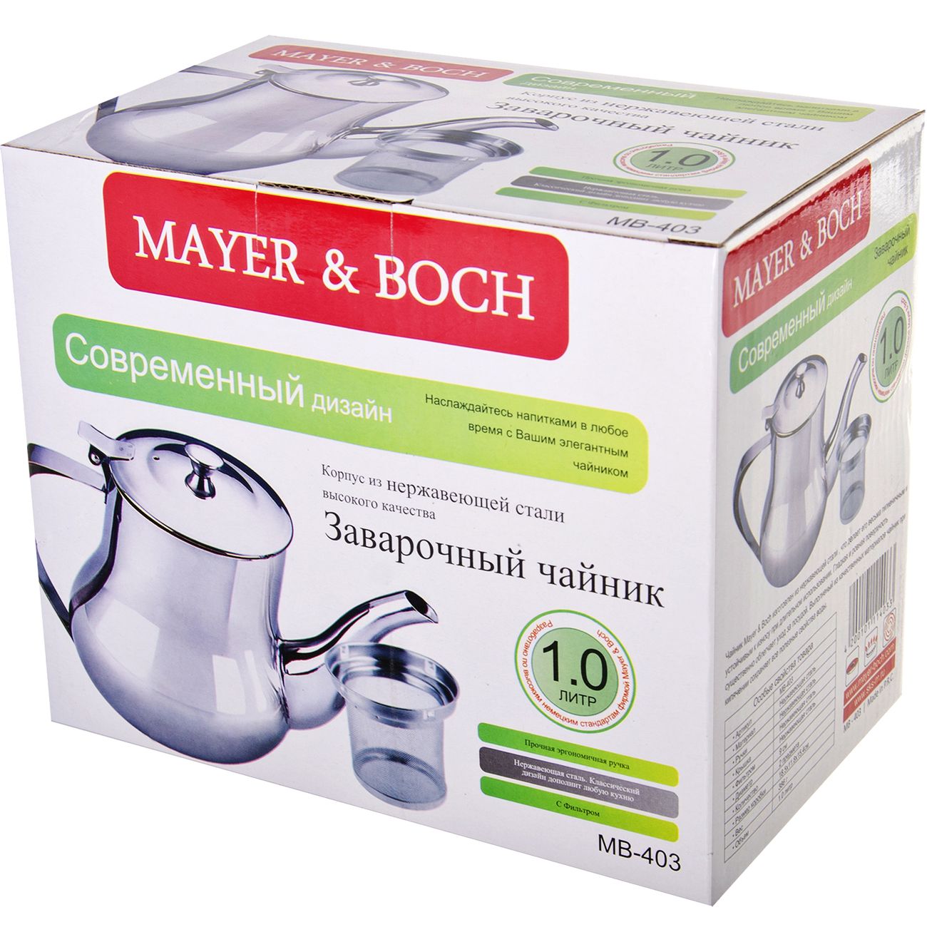 Вы можете купить Чайник Mayer&Boch 1л (403) в магазинах М.Видео по доступной цене. Чайник Mayer&Boch 1л (403): подробное описание, фото и отзывы реальных покупателей, характеристики, возможность скачать инструкции и подобрать аксессуары.