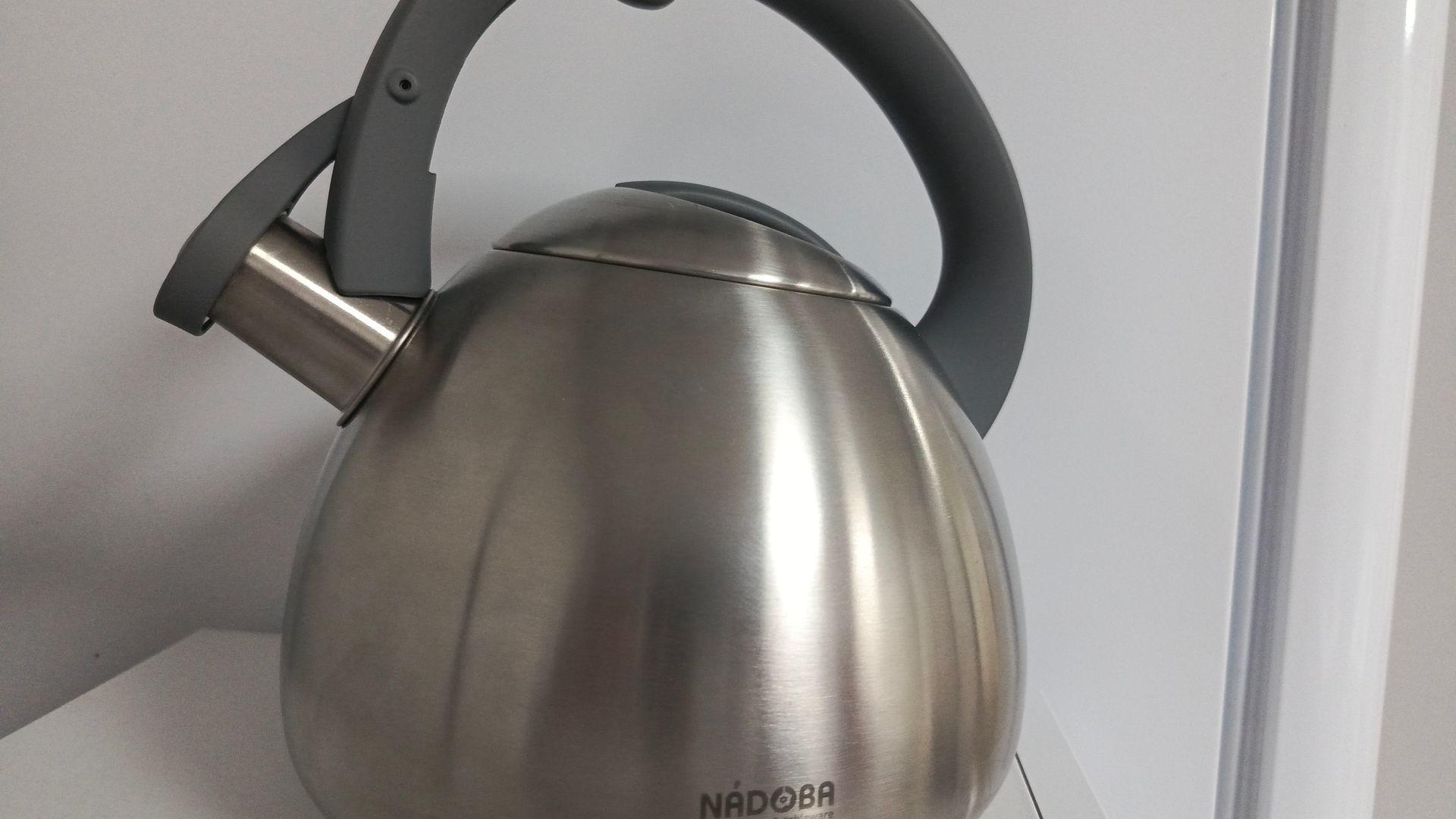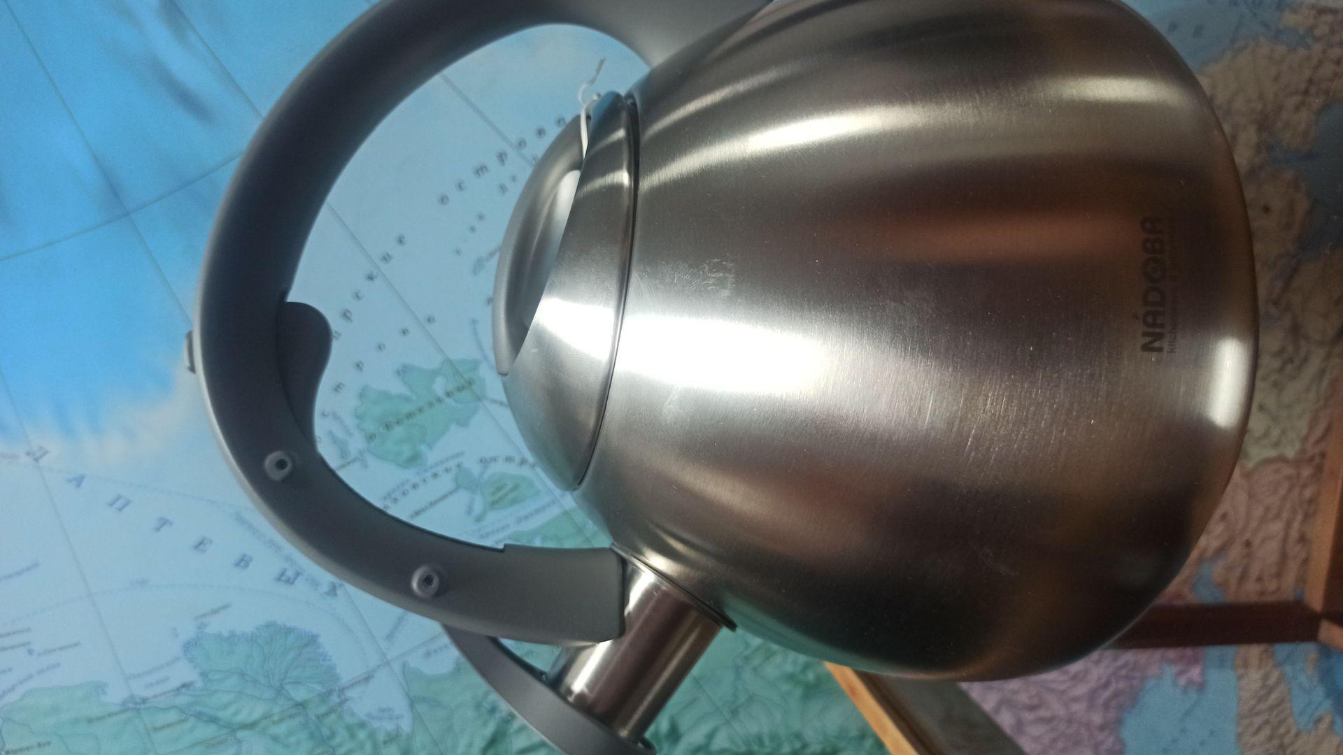 Лаконичный дизайн, именно такой и хотела. Ручка сделана из бакелита - не нагревается. Свисток из такого же материала. Покрытие довольно надежное - ничего не царапается после мойки даже грубыми губками. Накипи нет, потому что вода у нас + - хорошая. Я пользуюсь им каждый день, а как будто вчера купила, такой же блестящий.