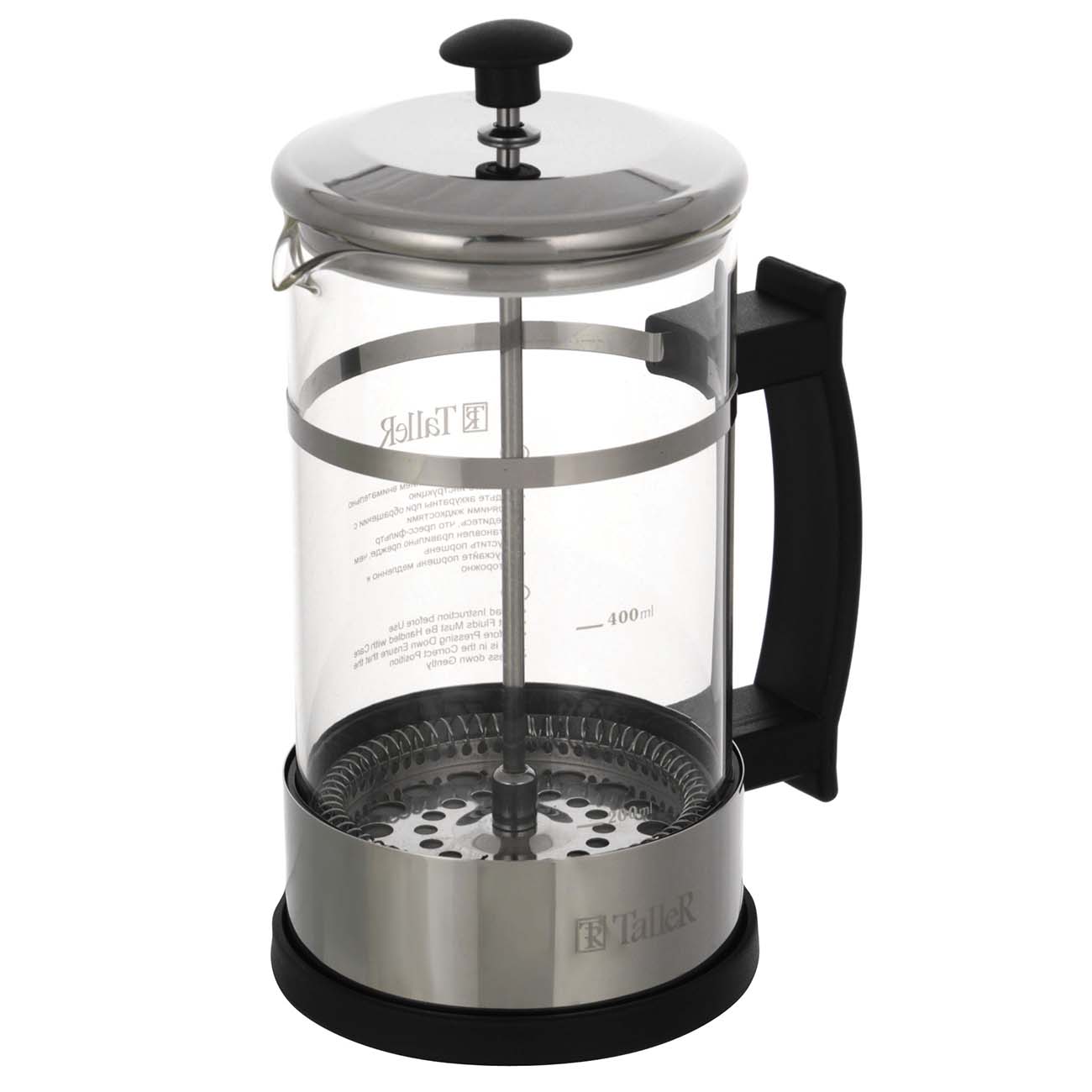 TalleR TR-32300 – френч-пресс объёмом 600 мл, который можно использовать для заваривания чая различных сортов, трав, кофе. Сетчатый фильтр, плотно прилегающий к стенкам, аккуратно отделит листья и гущу и прижмёт их к донышку.