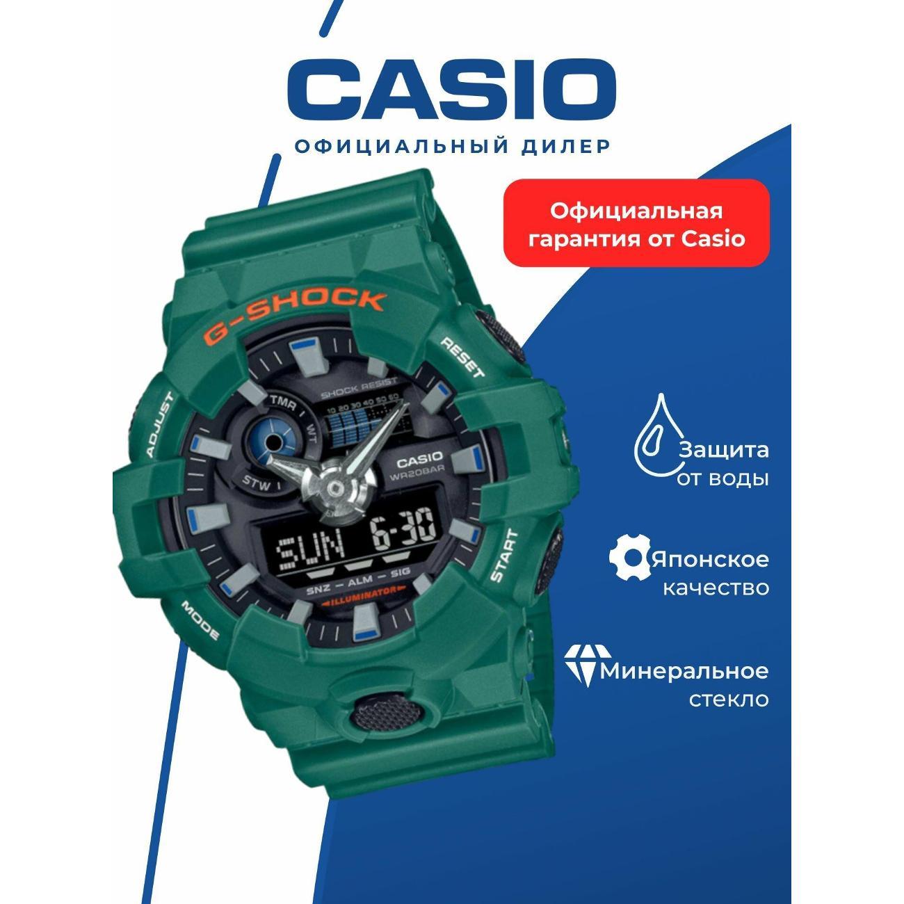 Перед вами аналого-цифровая модель из серии G-SHOCK GA-700 в стильном и крупном зеленом корпусе c черным циферблатом и инверсионным дисплеем. Благодаря новому переосмысленному дизайну и крупным стрелкам, часы имеют не только отличный внешний вид, но и обладают действительно удобной индикацией времени. Кнопка подсветки вынесена в самый низ корпуса, как у большинства премиальных моделей джишок, что позволит с легкостью ею воспользоваться даже на ощупь. Не забываем про стандартную для джишоков непревзойденную противоударность и водозащиту Сверхяркая подсветка При нажатии на кнопку подсветки экран ярко освещается в ультрамодный цвет. Ударопрочность Ударопрочная конструкция защищает от ударов и вибрации. Функция мирового времени Отображение текущего времени в основных городах и конкретных областях по всему миру. Функция секундомера- 1/100 сек. - 24 часа Прошедшее время измеряется с точностью в 1/100 секунды. Пределы измерения достигают 24 часов. Таймер - 1/1 мин. - 1 час Для поклонников точности: таймеры обратного отсчета напомнят Вам о текущих или особенных событиях, издав звуковой сигнал в установленное время. Время можно предварительно настроить от 1 минуты и до 1 часа. Идеальное решение для людей, которым необходимо ежедневно принимать лекарства или выполнять промежуточные упражнения (тренировки). 5 ежедневных будильников Будильник напомнит Вам о повторяющихся событиях с помощью звукового сигнала, установленного Вами на определенное время. Вы также можете активировать почасовой сигнал времени, сообщающий о каждом полном часе. Эта модель имеет пять независимых будильников для оповещения о важных встречах. Функция повтора будильника Каждый раз, когда Вы выключаете звуковой сигнал, он прозвучит повторно спустя несколько минут. Включение/выключение звука кнопок Можно отключить звук при нажатии кнопок. Это означает, что часы больше не будут издавать звуковой сигнал при переключении от одной функции на другую. Заранее установленные звуковые сигналы или таймеры обратного отчета остаются активными, если звук кнопок отключен. Функция перемещения стрелок Минеральное стекло Прочное, устойчивое к царапинам минеральное стекло защищает часы от повреждений. Корпус из полимерного пластика Ремешок из полимерного материала. Натуральный полимерный материал является идеальным для изготовления ремешка благодаря своей чрезвычайной прочности и гибкости. 5 лет - 1 аккумулятор Аккумулятор обеспечивает часы достаточным питанием приблизительно на пять лет. Водонепроницаемость (20 Бар) Идеально подходит для ныряния без акваланга: часы являются водонепроницаемыми до 20 Бар/на глубине до 200 метров . Значение метров не относится к глубине погружения, но относится к атмосферному давлению, используемого в процессе испытания на водонепроницаемость. (ISO 2281) Габариты: 57,5 x 53,4 x 18,4 мм Вес: 69 гр