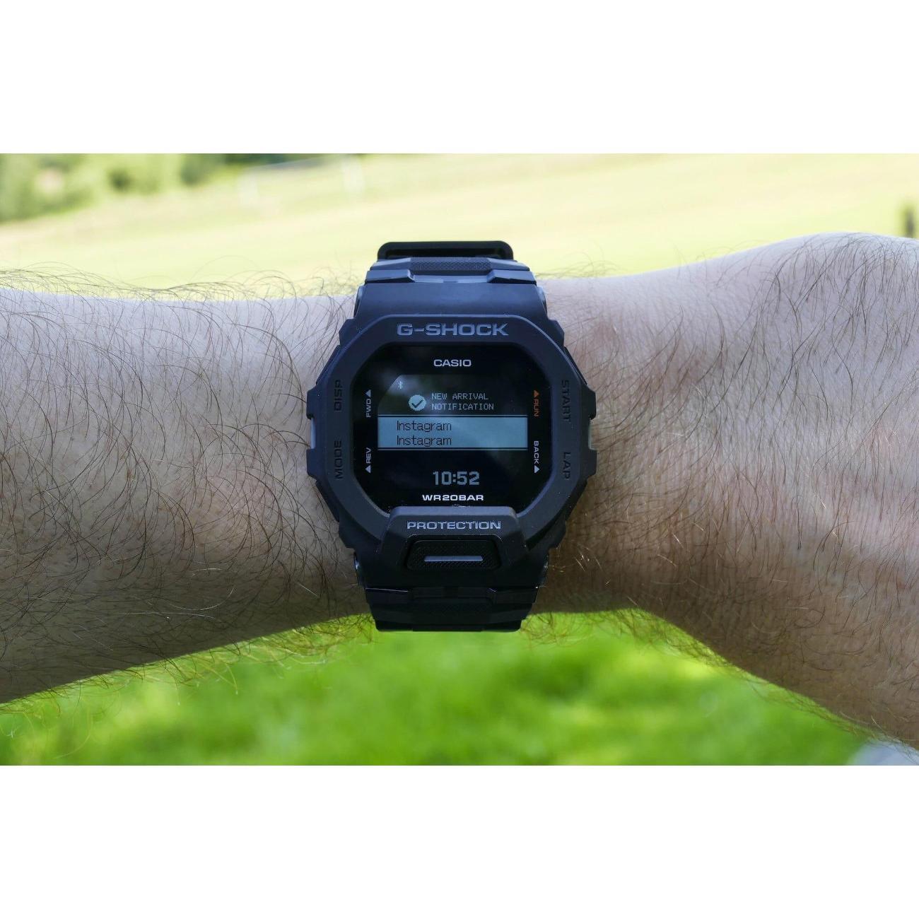 Мужские кварцевые электронные наручные часы. Серия Casio G-SHOCK G-SQUAD. Противоударный корпус защищает механизм от ударов и вибрации. Часы оснащены технологией Bluetooth. Если часы подключены к смартфону, время устанавливается автоматически и отображается текущее время. Сверхмощная светодиодная подсветка - при недостаточной освещенности поворот запястья включит яркую цветную подсветку часов. Индикация входящих вызовов и сообщений. Функция поиска телефона. Функция вибро-уведомлений. Акселерометр. - датчик движения реагирует на ускорение, а затем отображает полученные данные как скорость на экране дисплея. Отображение расходования калорий. Авиарежим - часы переключаются в режим оффлайн нажатием кнопки. С помощью этой функции можно отключить радио- и GPS-приемник на время перелета. Функция секундомера с точностью измерения 1/100 секунды и пределом измерения 100 часов. Память на 100 кругов. 5 независимых таймеров. Автоматический календарь. 12/24х часовой формат времени. 4 ежедневных будильника. Функция повтора будильника. Функция мирового времени отображает текущее время в крупных городах и конкретных районах по всему миру. Включение/выключение звука кнопок. Корпус и ремешок из полимерного пластика.
