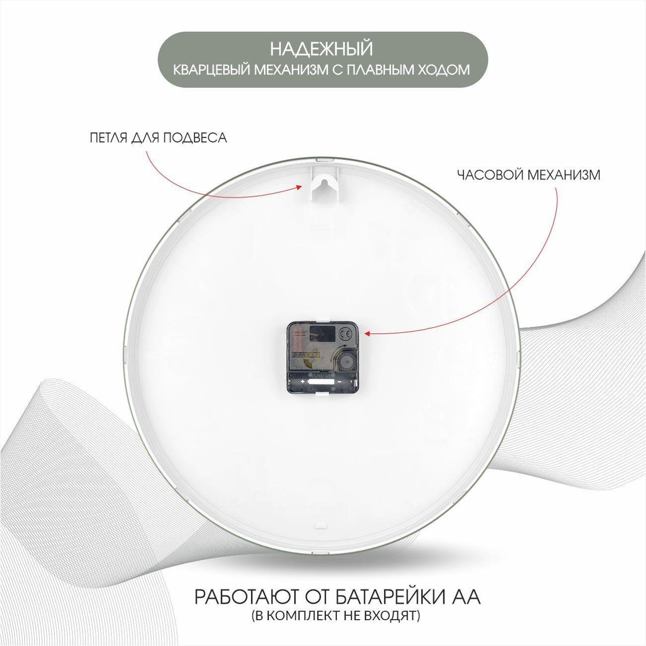 Кварцевый механизм с плавным ходом стрелки приводится в действие одной батарейкой типа АА (не входит в комплект).