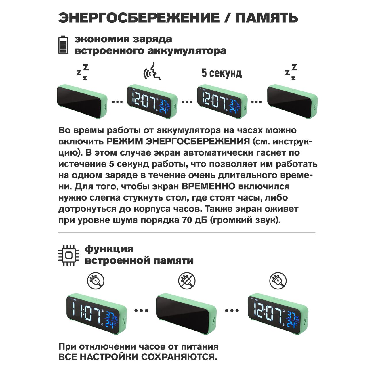 Часы обладают встроенной памятью, сохраняющей настройки при отключении питания. Высота цифр 38 мм. Работает устройство от аккумулятора (не менее месяца без подзарядки), от сети или от USB (шнур поставляется в комплекте). С помощью двух будильников и восемнадцати вариантов мелодий можно отрегулировать режим в будние дни и в выходные. Корпус размерами 16,8 х 6,6 х 3,6 см выполнен из пластика. Срок службы механизма — 25000 часов.