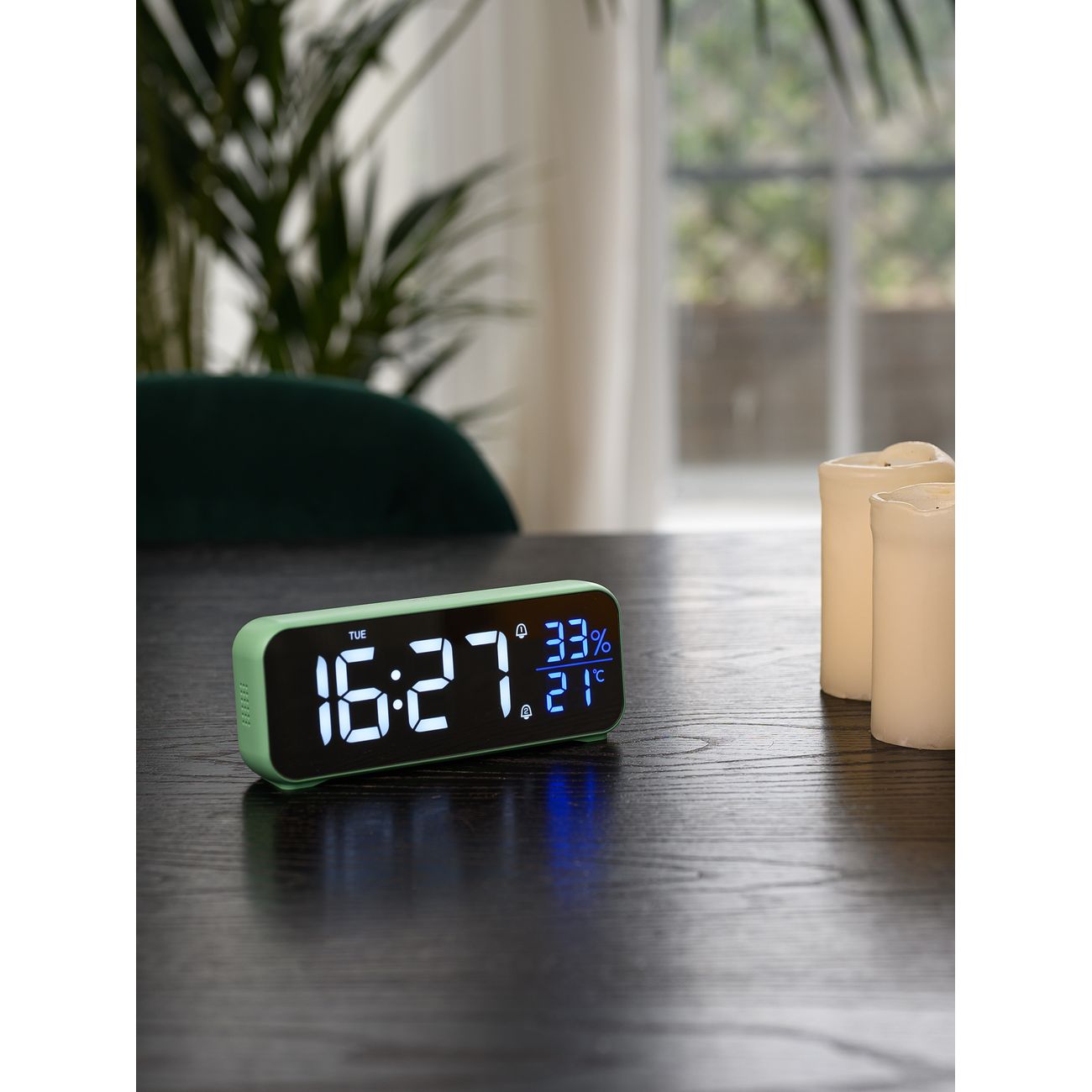 Настольные электронные часы Artstyle CL-82GRW с бело-голубой индикацией и бесшумным механизмом управляются с помощью сенсорных кнопок. Помимо времени, отображающемся в двух режимах (24 или 12 часов), на экран выводятся день недели, температура (по шкале Цельсия или Фаренгейта) и влажность воздуха. Пять вариантов подсветки экрана регулируются автоматически или вручную.