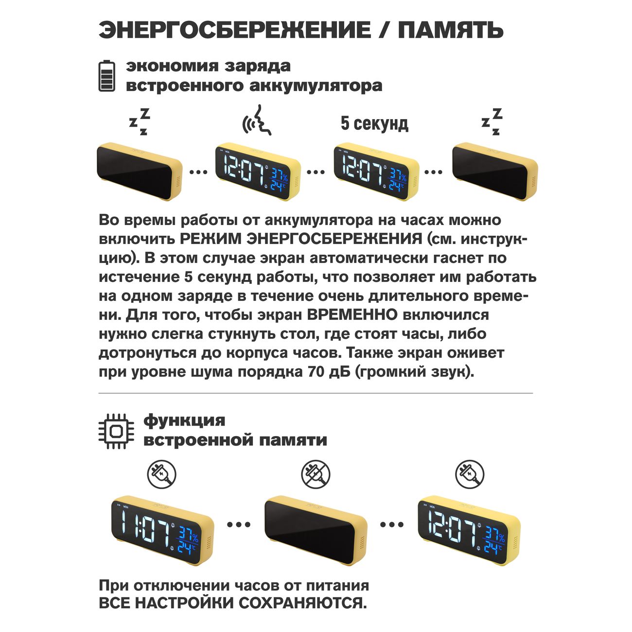 Часы обладают встроенной памятью, сохраняющей настройки при отключении питания. Высота цифр 38 мм. Работает устройство от аккумулятора (не менее месяца без подзарядки), от сети или от USB (шнур поставляется в комплекте). С помощью двух будильников и восемнадцати вариантов мелодий можно отрегулировать режим в будние дни и в выходные. Корпус размерами 16,8 х 6,6 х 3,6 см выполнен из пластика. Срок службы механизма — 25000 часов.