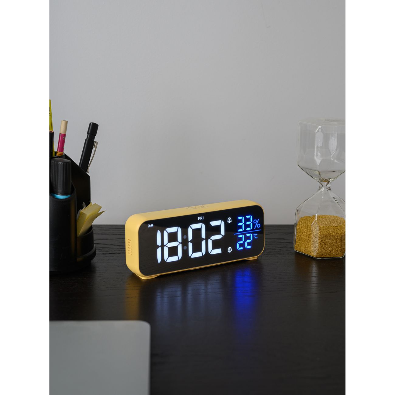 Настольные электронные часы Artstyle CL-82YW с бело-голубой индикацией и бесшумным механизмом управляются с помощью сенсорных кнопок. Помимо времени, отображающемся в двух режимах (24 или 12 часов), на экран выводятся день недели, температура (по шкале Цельсия или Фаренгейта) и влажность воздуха. Пять вариантов подсветки экрана регулируются автоматически или вручную.