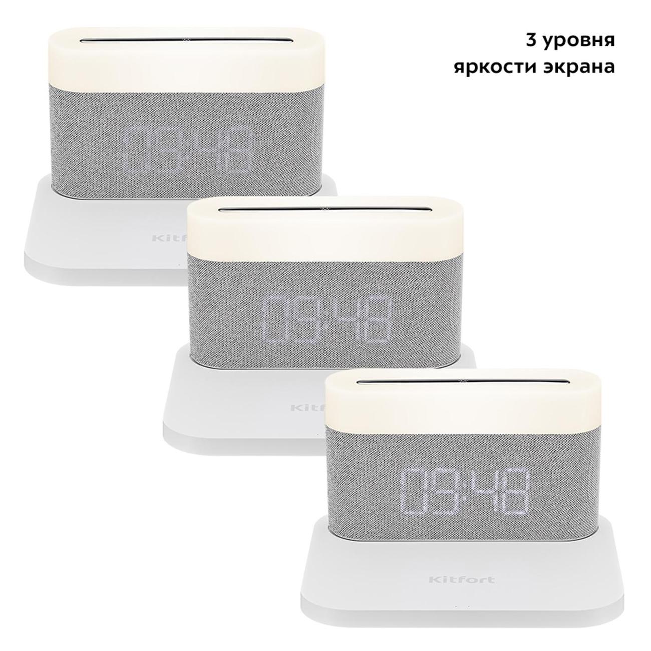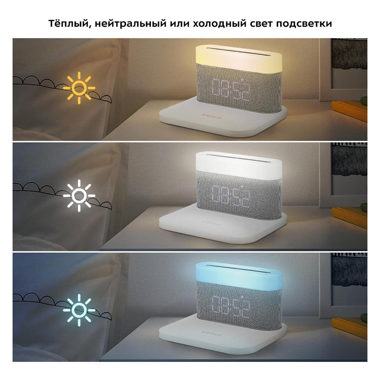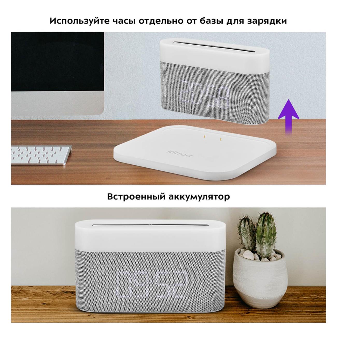 Настольные электронные часы Kitfort КТ-3373-2 — модель с интуитивно понятным и простым управлением, оснащенная быстрой беспроводной зарядкой (протокол QI). Благодаря последней можно заряжать смартфон. Особенность устройства — наличие яркой, эффектной подсветки (теплая, нейтральная или холодная белая). Чтобы переключить уровень яркости или отключить ее, необходимо нажать на сенсорную кнопку «Подсветка». Можно установить будильник и отрегулировать его громкость. Источником питания служит литий-ионный аккумулятор. Для зарядки используется USB Type-C. Размеры часов — 101х178х154 мм, вес — 442 кг.