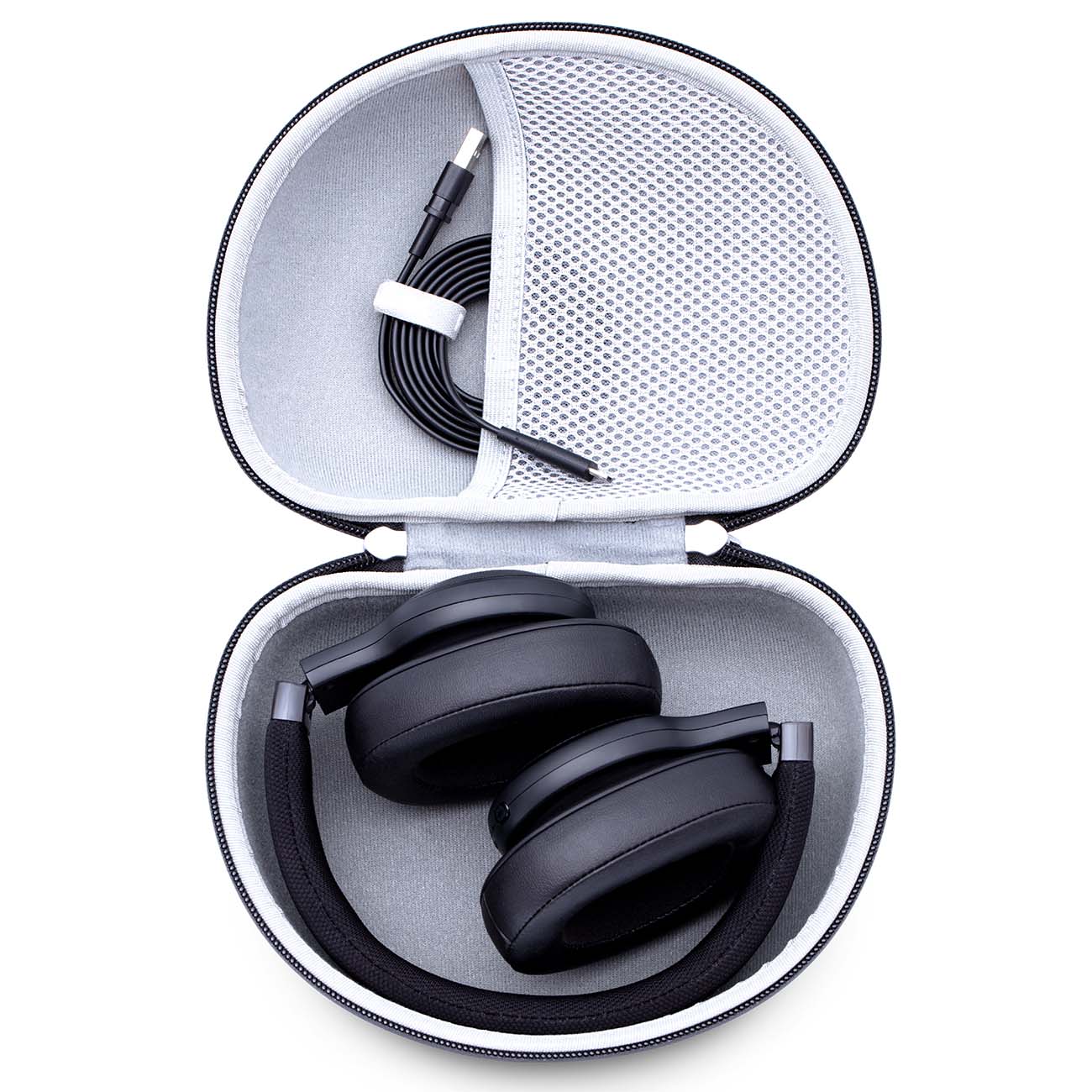 Для производства используется EVA, специально разработанный материал. Благодаря водоотталкивающей способности ткани и молнии гарнитура защищена от царапин и ударов, а также от пагубного влияния пыли и влаги. Универсальный размер подходит для хранения большинства наушников известных брендов.