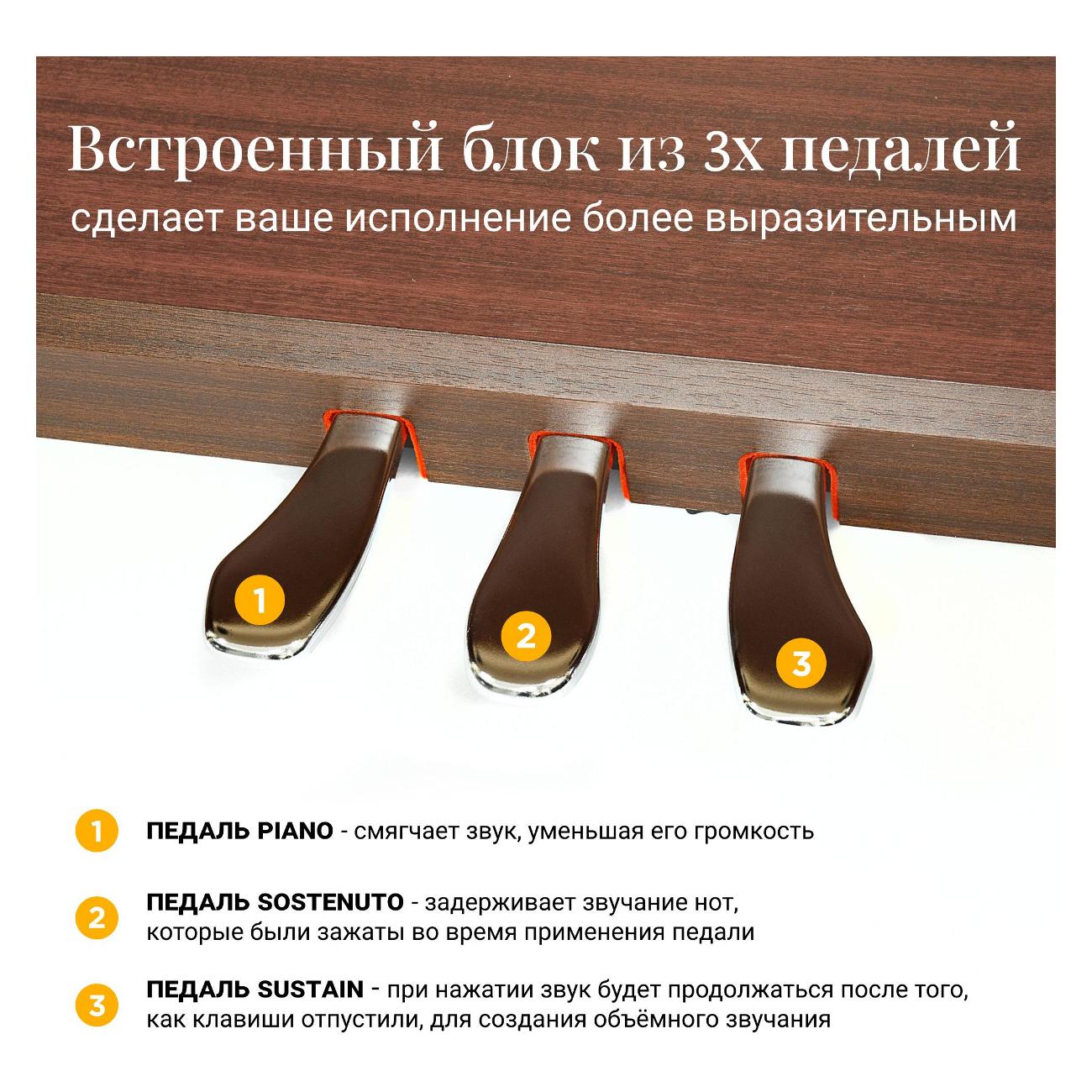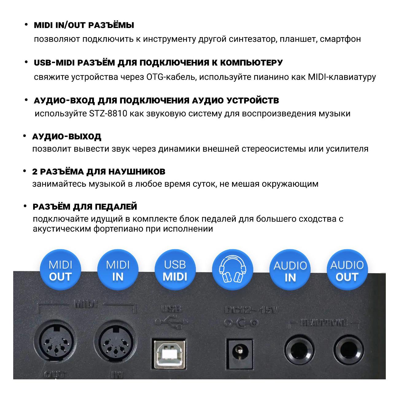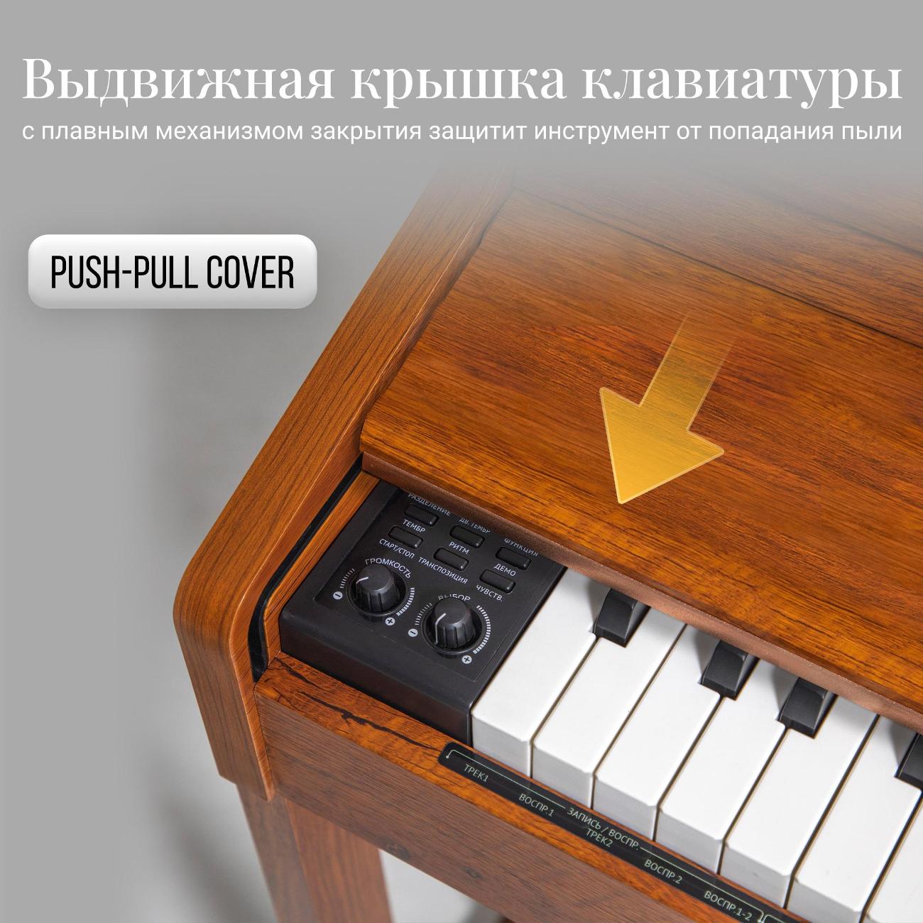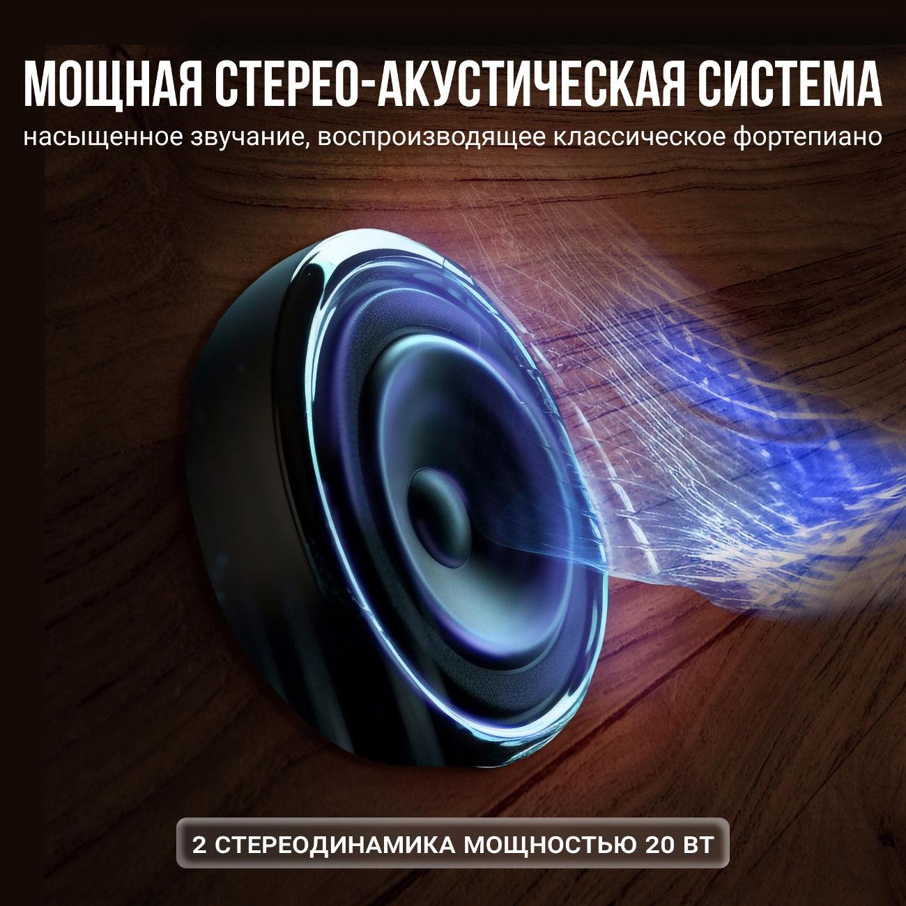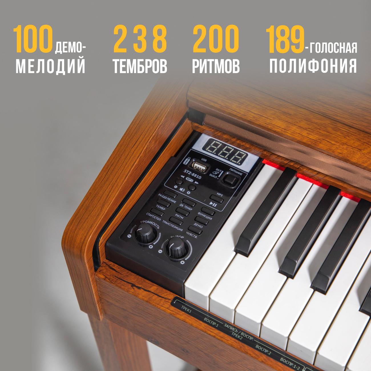 Цифровое пианино Tesler STZ-8810 оснащено выдвижной крышкой, надежно защищающей устройство от пыли. Акустическая система устройства обеспечивает яркое и насыщенное звучание, которое максимально точно имитирует звучание акустического пианино. Используя эту модель, можно записывать и прослушивать собственные композиции. Для подключения к сторонним устройствам используются разъемы MIDI IN/OUT. Подставка, которая поставляется вместе с пианино, оснащена трехпедальным блоком.