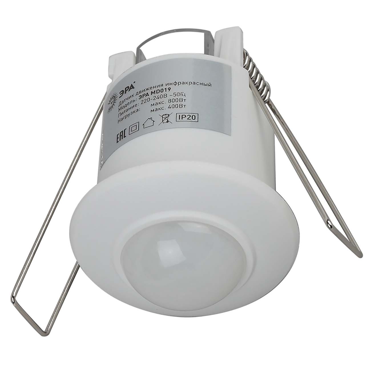 Датчик движения «Эра» MD 019 устанавливается в стандартное гнездо для встраиваемого светильника и прочно закрепляется подпружиненными металлическими скобами. Он включает освещение только в присутствии человека, помогая экономить электроэнергию.