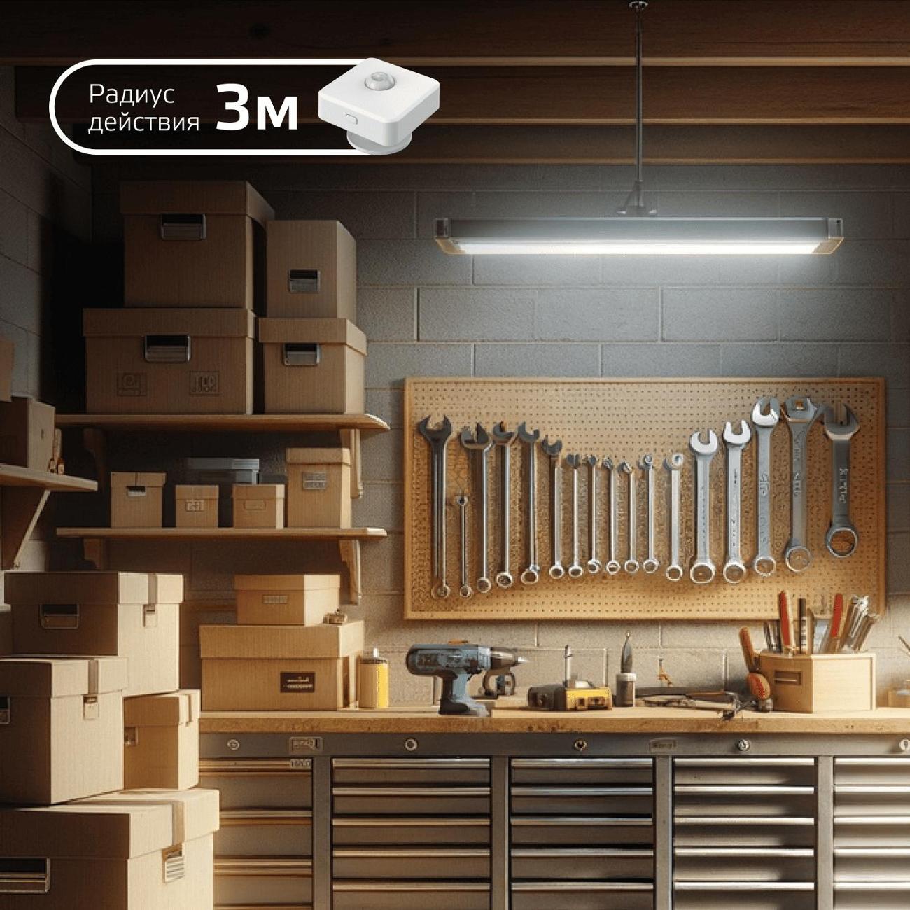 Угол обнаружения составляет 120°. Реализован дистанционный тип управления. Номинальное напряжение достигает 3 Вт. Корпус сделан из пластика белого цвета. Габариты прибора — 62х49х62 мм, вес — 57 г. Датчик можно фиксировать на потолке или стене. Оптимальная высота установки — 2 м. Корпус защищен от попадания пыли и влаги по стандарту IP20.