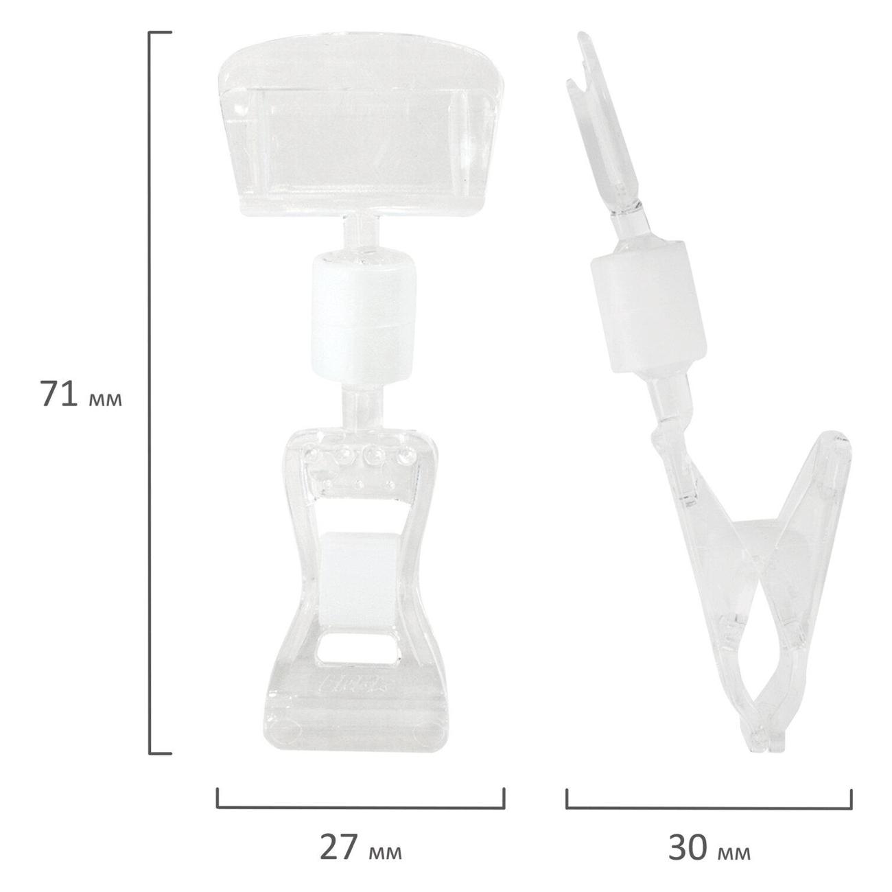 Держатели-прищепки изготовлены из поликарбоната. Он прочный, легкий, оптически прозрачный, пластичный, морозостойкий и очень долговечный. Держатель-прищепка имеет размеры 71х27х30 мм. Максимальная толщина вставки составляет 3 мм. 10 штук в комплекте.