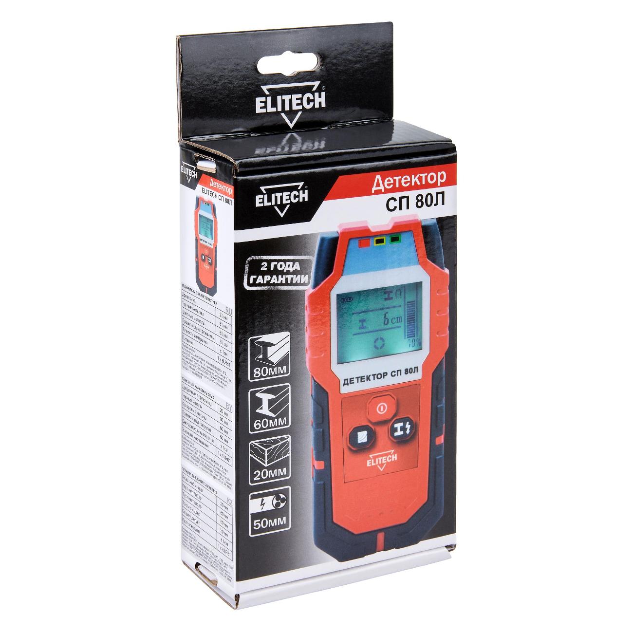 Вы можете купить Детектор металла (проводки) Elitech СП 80Л в магазинах М.Видео по доступной цене. Детектор металла (проводки) Elitech СП 80Л: подробное описание, фото и отзывы реальных покупателей, характеристики, возможность скачать инструкции и подобрать аксессуары.