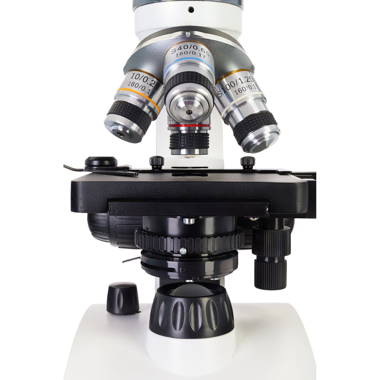 Микроскоп оснащен двумя светодиодами, конденсором Аббе с ирисовой диафрагмой и держателем фильтра. Это позволяет выстроить максимально четкую подсветку. Световые элементы работают от батареек, их яркость можно регулировать.
