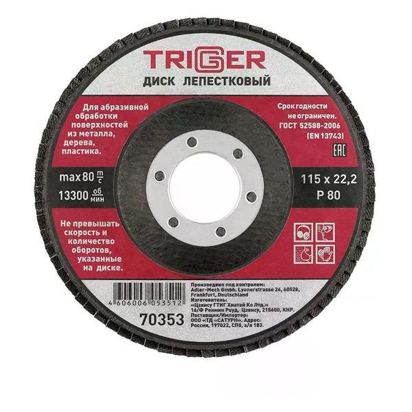 Диск лепестковый Trigger 70353 по металлу 115х22 мм P80. Предназначен для установки на точильные станки для зачистки, удаления мелких дефектов и заусенцев на металлических, деревянных и пластиковых поверхностях. Абразивный материал - электрокорунд (оксид алюминия). Гибкая основа. Удобны для абразивной обработки плоских, вогнутых и выпуклых форм и поверхностей, обработки кромок и сварных швов деталей и конструкций. Благодаря эластичности лепестков легко профилируются при обработке фасонных поверхностей. Тип товара : Диск лепестковый; Диаметр, мм : 115; Посадочный диаметр, мм : 22; Зернистость, Р : Р80; Назначение : дерево,металл,пластмасса