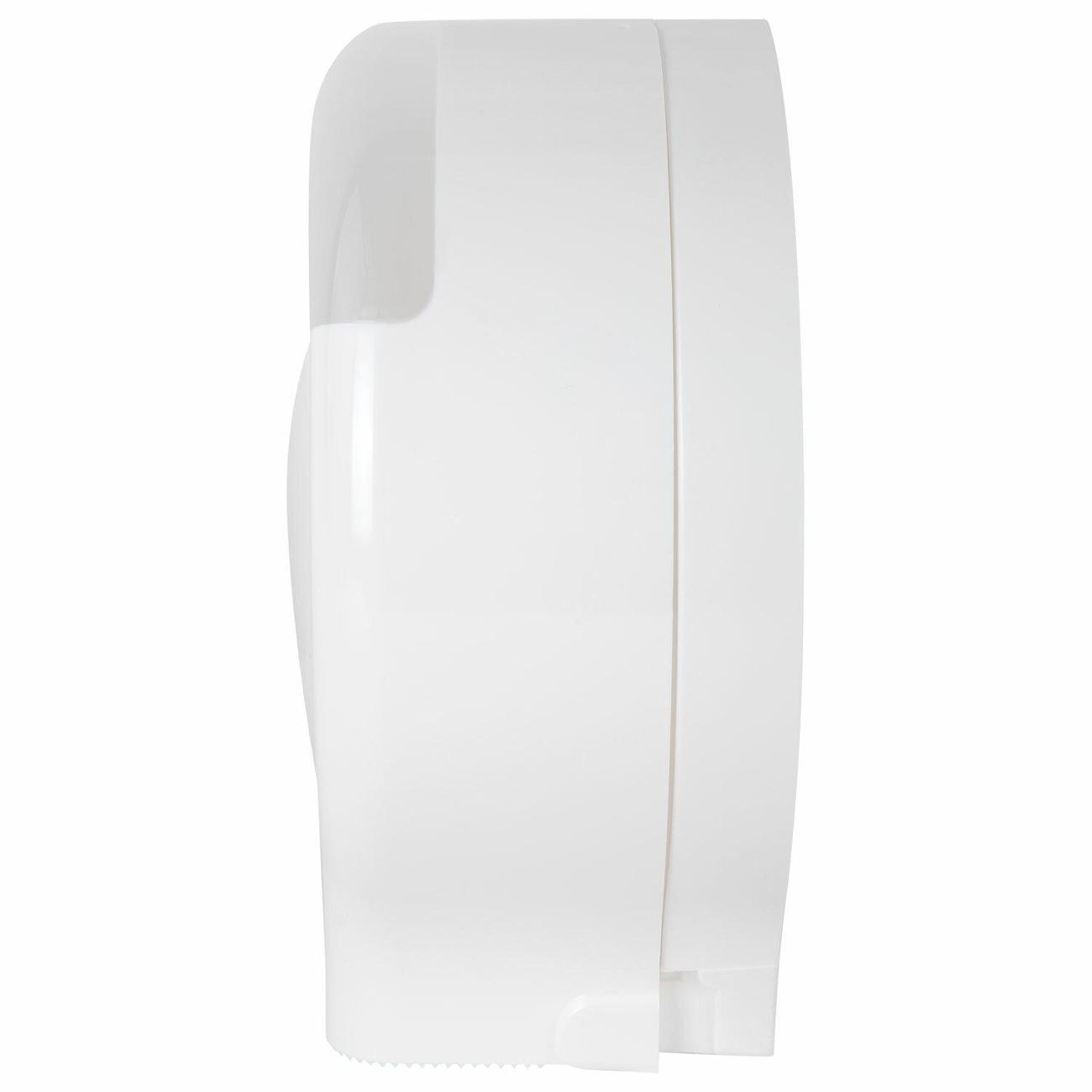 Антивандальный корпус изготовлен из ударопрочного ABS-пластика. Предназначен для подачи профессиональной туалетной бумаги в рулонах с намоткой до 200 м. Обеспечивает высокий уровень гигиены и комфортную подачу туалетной бумаги. Имеется окошко для контроля остатка расходных материалов. Сочетается с расходными материалами других производителей. Оборудован самозахлопывающимся замком с ключом. В комплект входят крепежные материалы для установки. Размер – 255х270х120 мм, цвет – белый.