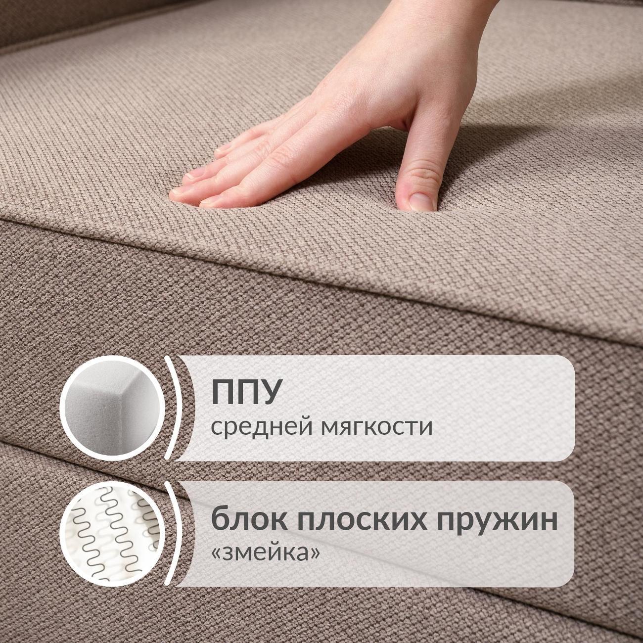 Здоровый сон. Внутри сиденья скрыт блок плоских пружин «Змейка» в сочетании с упругим ППУ. Это обеспечивает ортопедическую поддержку спины, бесшумность (диван не скрипит) и защиту от провисания.