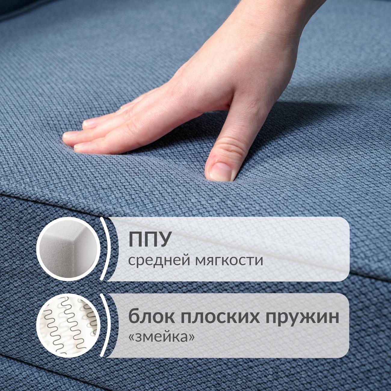Здоровый сон. Внутри сиденья скрыт блок плоских пружин «Змейка» в сочетании с упругим ППУ. Это обеспечивает ортопедическую поддержку спины, бесшумность (диван не скрипит) и защиту от провисания.