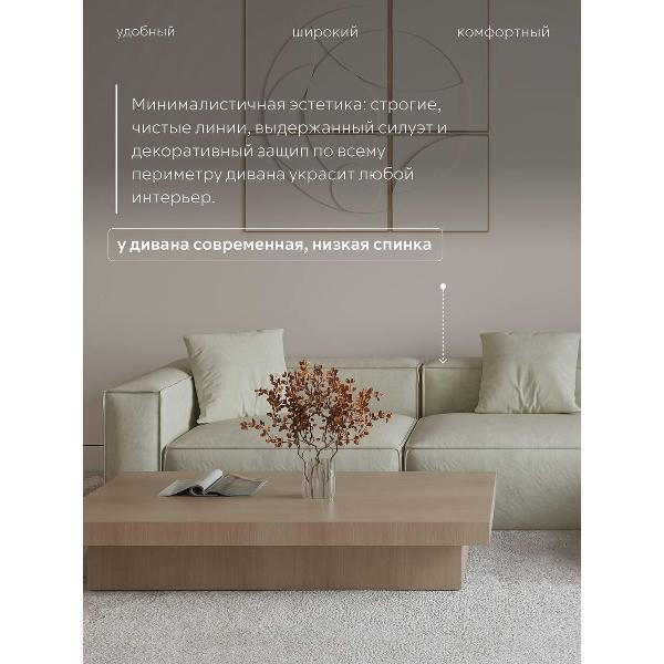 Главное преимущество — модульная конструкция. В комплекте 8 универсальных модулей, которые можно переставлять и комбинировать: прямой диван, П-образная форма, диван с банкеткой или компактный вариант для небольшой квартиры. Конфигурацию легко менять под свои нужды, а при необходимости можно докупить дополнительные модули.