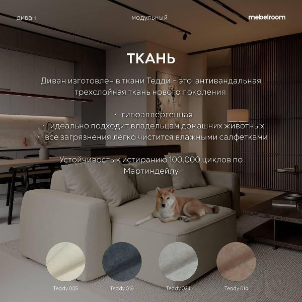 Обивка: велюр Teddy и мягкая ткань Барса — приятные на ощупь, износостойкие и легко очищаемые, придающие дивану стильный современный вид.