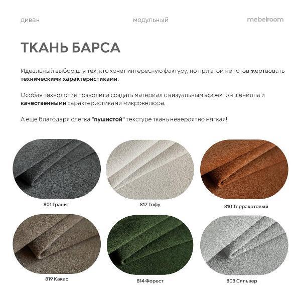 Обивка: износостойкая и легко очищаемая ткань; варианты — велюр Teddy для уюта и теплоинтерьера, или мягкая современная ткань Барса.