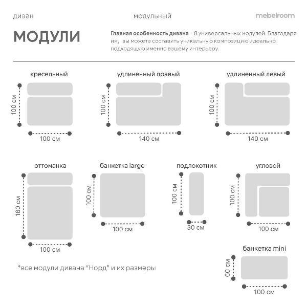 Модульный угловой диван «Норд» от Mebelroom.shop — стильное и функциональное решение для современного интерьера, созданное для комфорта и уюта. Главная особенность модели — восемь универсальных модулей, которые можно комбинировать и переставлять, адаптируя диван под размеры комнаты. Такой вариант подходит как для просторной гостиной, так и для компактной квартиры.