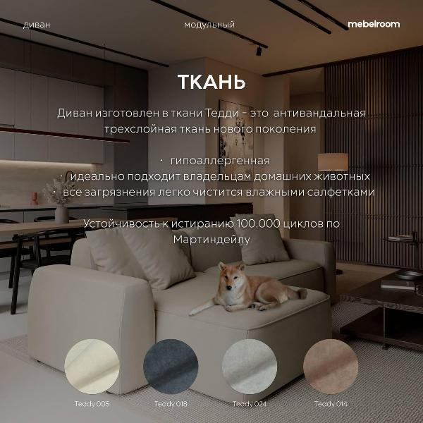 Обивка: износостойкая и легко очищаемая ткань; варианты — велюр Teddy для уюта и теплоинтерьера, или мягкая современная ткань Барса.