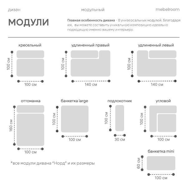 Секции модульного дивана Норд от Mebelroom.shop — универсальные элементы, позволяющие создавать диван любой конфигурации, идеально адаптированный под размеры комнаты и ваши потребности. Каждая секция разработана с акцентом на комфорт и долговечность, обеспечивая удобство при ежедневном использовании.