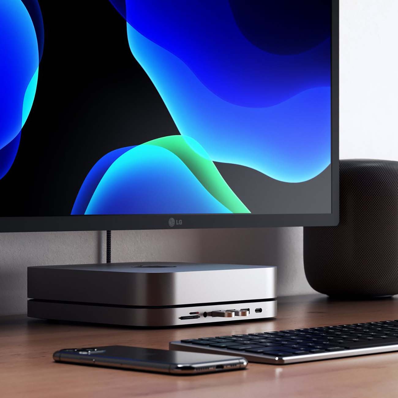 Док-станция для Mac Mini Satechi Mac Mini Stand & Hub — компактная хаб-поставка с прочным темно-серым корпусом из шлифованного алюминия. В нем предусмотрена специальная выемка, идеально подходящая по форме для размещения настольного компьютера. Специальные прорезиненные вставки предотвращают появление царапин на корпусе Mac Mini.