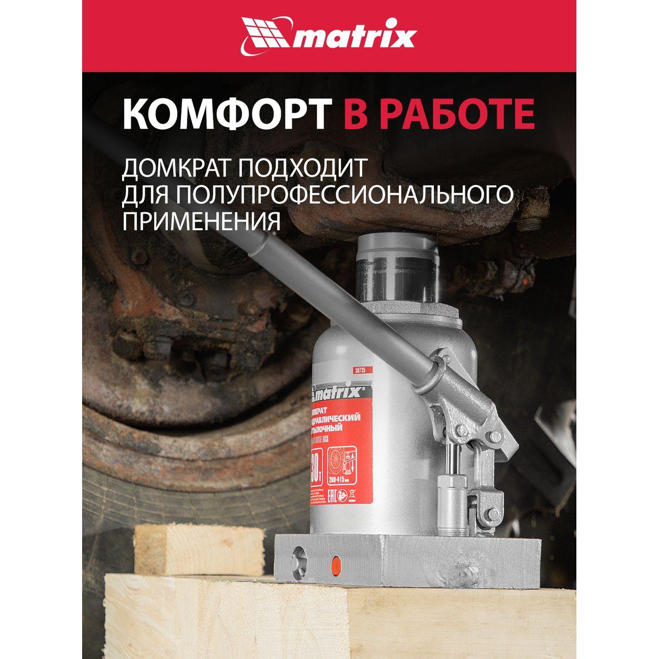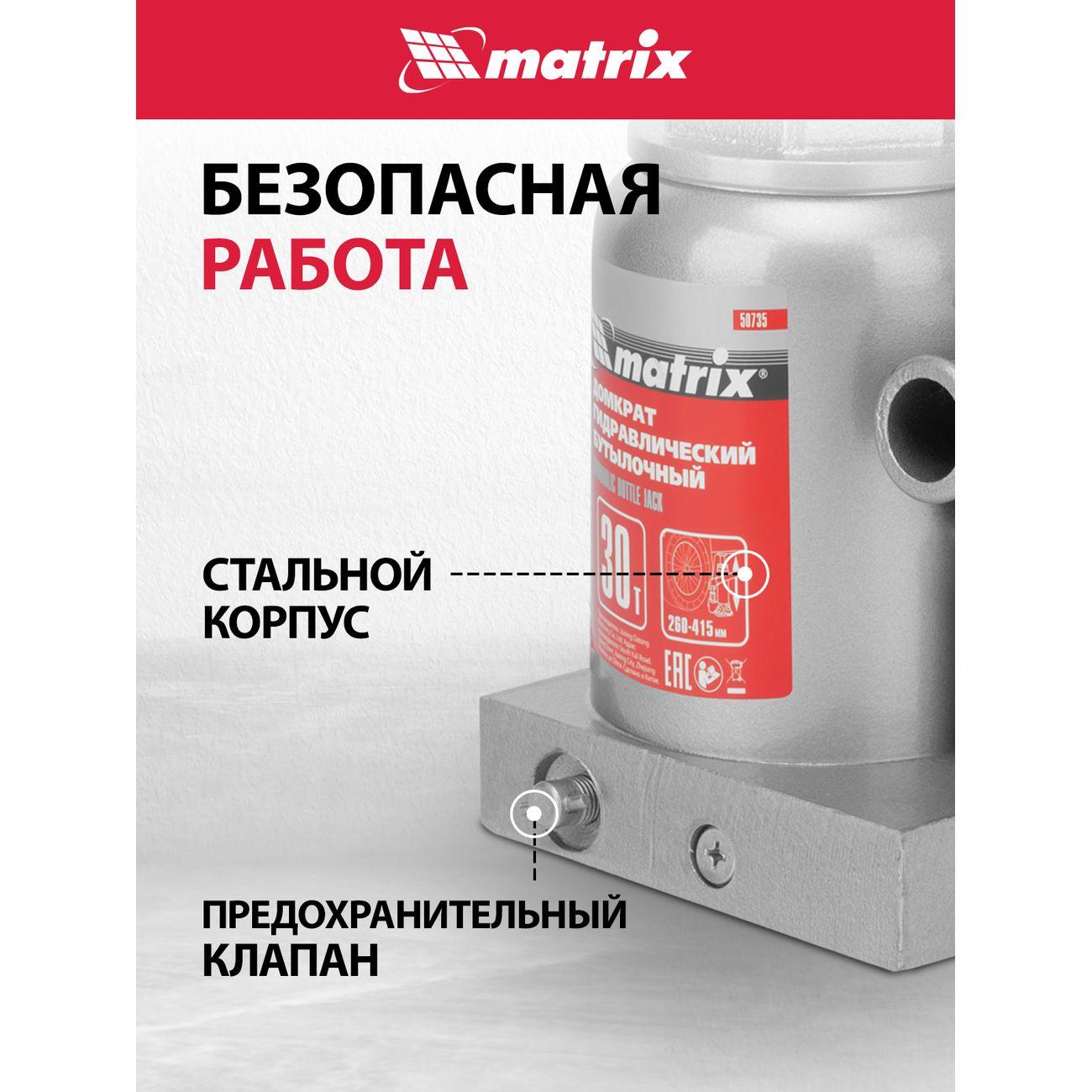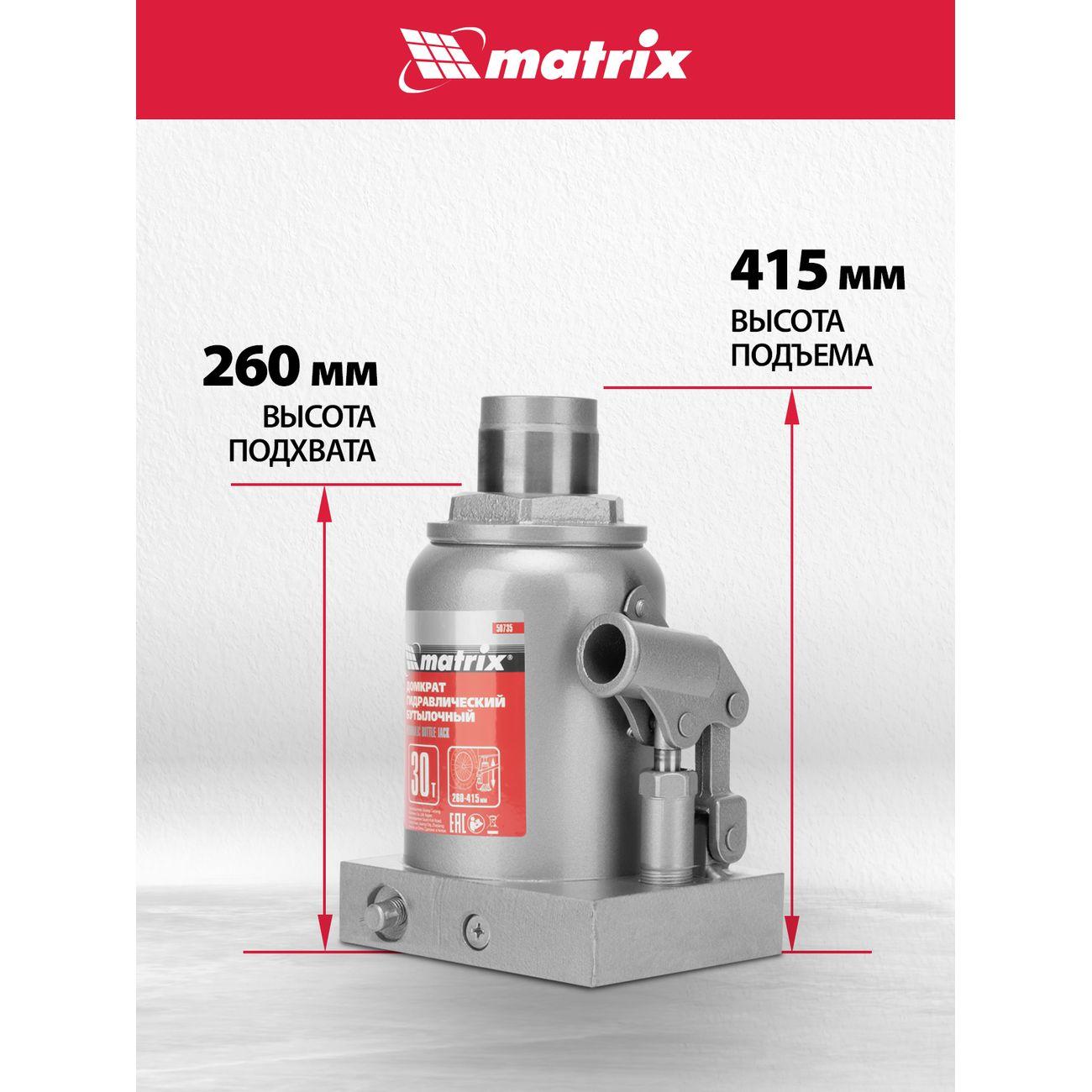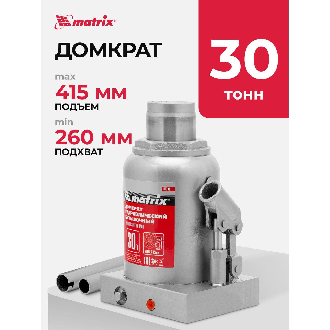 Вы можете купить Домкрат автомобильный бутылочный Matrix 30т, 260-415мм (50735) в магазинах М.Видео по доступной цене. Домкрат автомобильный бутылочный Matrix 30т, 260-415мм (50735): подробное описание, фото и отзывы реальных покупателей, характеристики, возможность скачать инструкции и подобрать аксессуары.