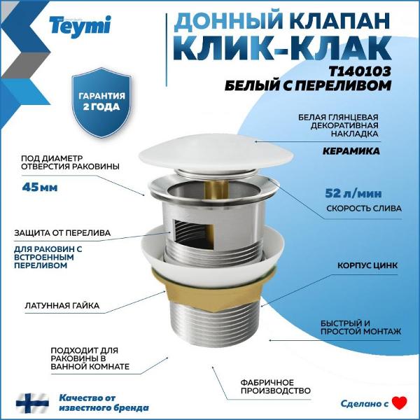 Донный клапан Teymi для раковины с переливом, белый T140103. Донный клапан Teymi для раковины с переливом, белый — это высококачественный и функциональный элемент для вашей ванной комнаты. Изготовленный из цинка, этот донный клапан обладает долговечностью и надежностью. Глянцевая поверхность идеально сочетается с любым интерьером ванной комнаты, придавая ему элегантный и современный вид. Декоративная накладка выполнена из керамики. Донный клапан Teymi оснащён системой с переливом, что позволяет эффективно предотвращать утечку воды. Скорость слива воды составляет 52 л/мин, что обеспечивает быстрое и эффективное удаление воды из раковины. Удобство монтажа обеспечивается благодаря диаметру отверстия раковины, который составляет 45 мм. В комплекте с донным клапаном идёт гарантийный талон на 2 года, подтверждающий высокое качество и долговечность изделия. Донный клапан Teymi для раковины с переливом, белый (T140103) — это отличный выбор для тех, кто ценит качество и стиль в своей ванной комнате. Продукция произведена на суперсовременной фабрике в Китае, специализирующейся на выпуске данных изделий, под контролем специалистов Teymi. Известный финский бренд Teymi гарантирует высокое качество и надежность своих товаров. Характеристики: -- Артикул производителя: T140103; -- Тип изделия: донный клапан для раковины; -- Область применения: ванная комната; -- Материал корпуса: цинк; -- Цвет крышки: белый; -- Материал крышки: керамика; -- Покрытие крышки: глянцевое; -- Материал гайки: латунь; -- Функция клик-клак: да; -- Скорость слива воды: 52 л/мин; -- Диаметр отверстия раковины: 45 мм; -- Гарантия: 2 года; -- Страна производства: Китай; -- Страна бренда: Финляндия; -- Бренд: Teymi.