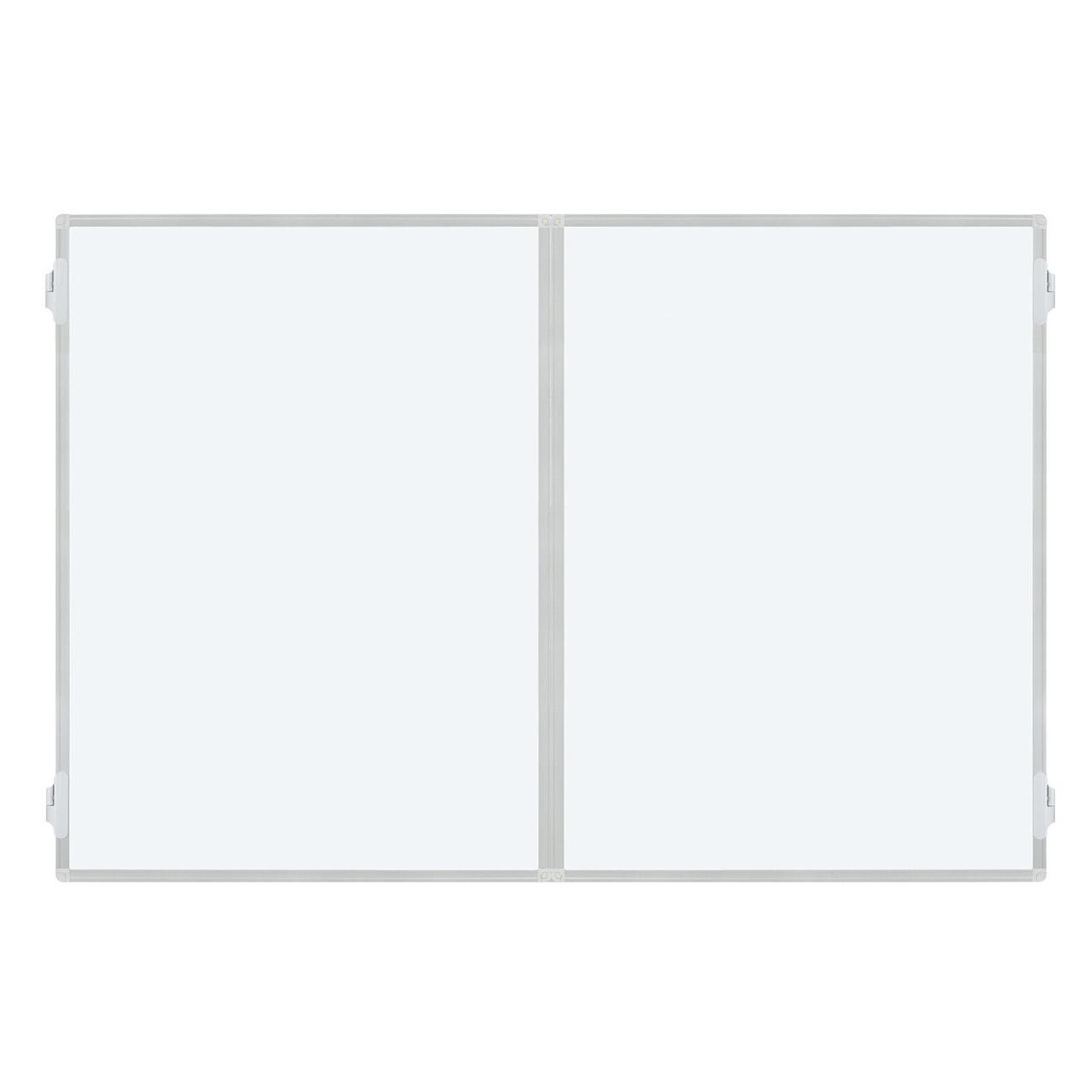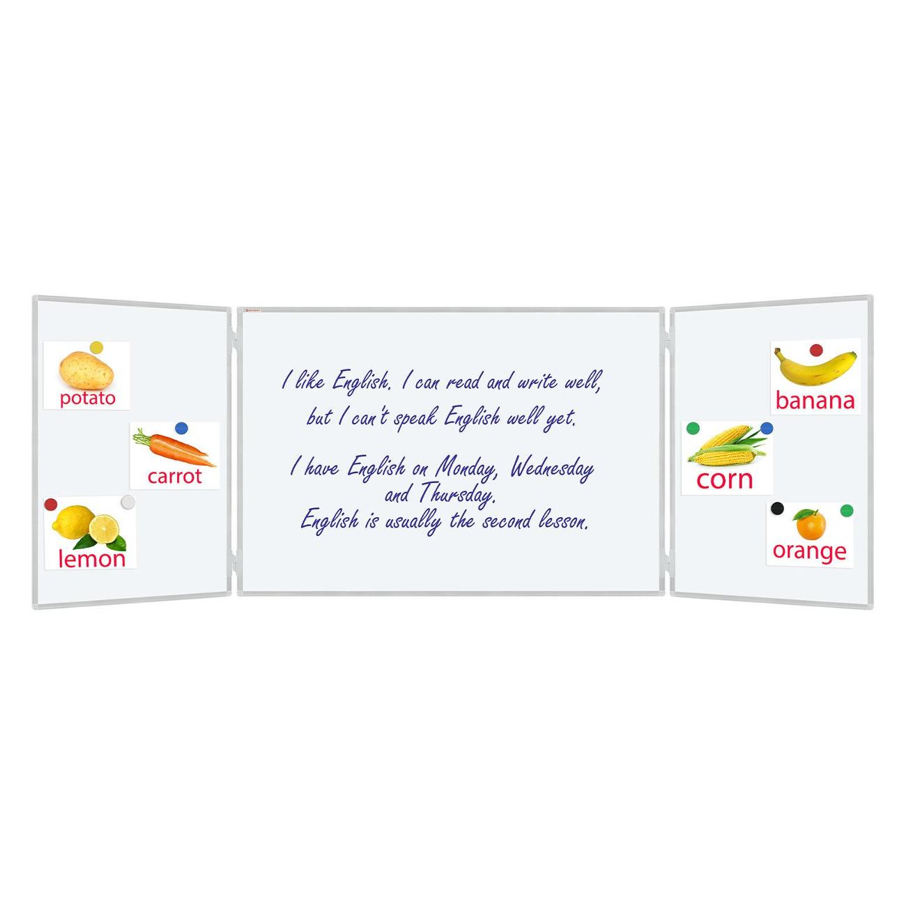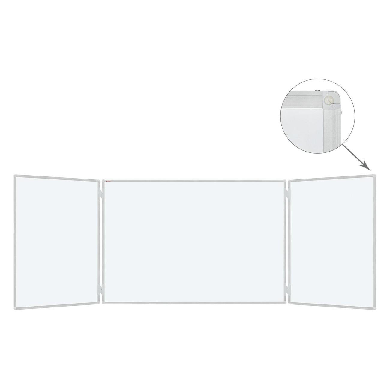 Трехэлементная магнитно-маркерная доска белого цвета имеет центральную одностороннюю секцию размером 100х150 см и две боковые секции - 100х75 см каждая.