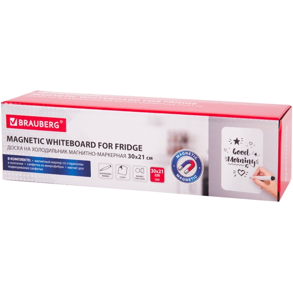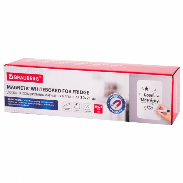 В комплекте: черный маркер для белых досок с магнитом и стирателем в колпачке, салфетка из микрофибры (с «ушком» для подвешивания) и магнит специальной формы, удобной для подвешивания салфетки. Во избежание преждевременного высыхания маркер рекомендуется хранить на холодильнике, колпачком вниз.