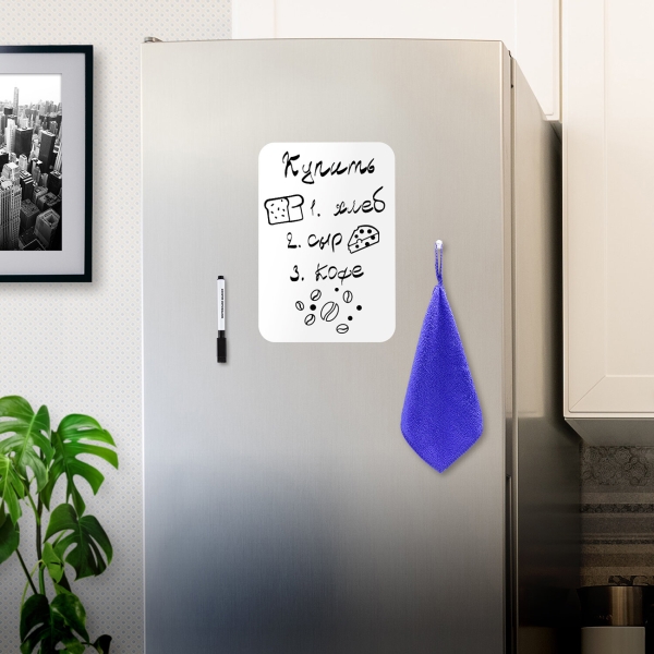 Это идеальный инструмент для личного планирования, заметок или переписок со своими домочадцами, рисования или черчения графиков, ведения учёта калорий, продуктов, необходимых для покупки. Доска замечательно подходит для развития творческих способностей. Имеет многоразовую поверхность "пиши-стирай", выполненную из ПВХ.