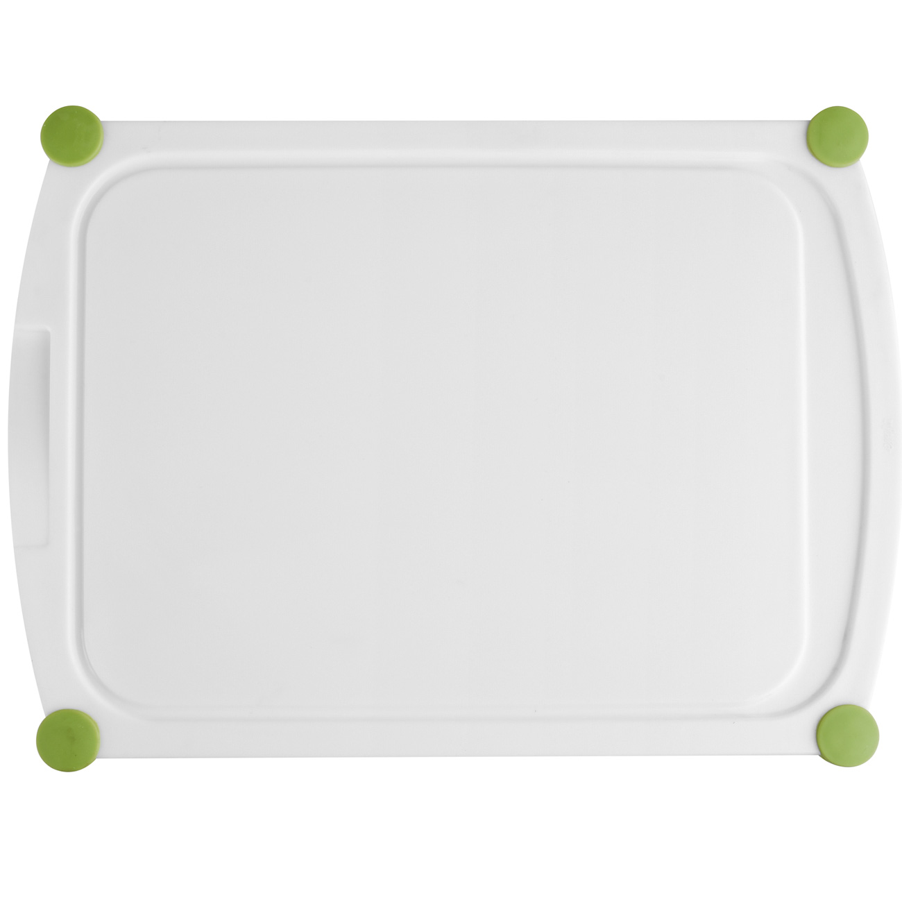 Специальная канавка в доске собирает жидкости (сок из овощей и фруктов или кровь из мяса), не позволяя им протекать на стол. Нескользящие резиновые ножки делают её устойчивой на любых поверхностях, в том числе и на стеклянных столешницах.