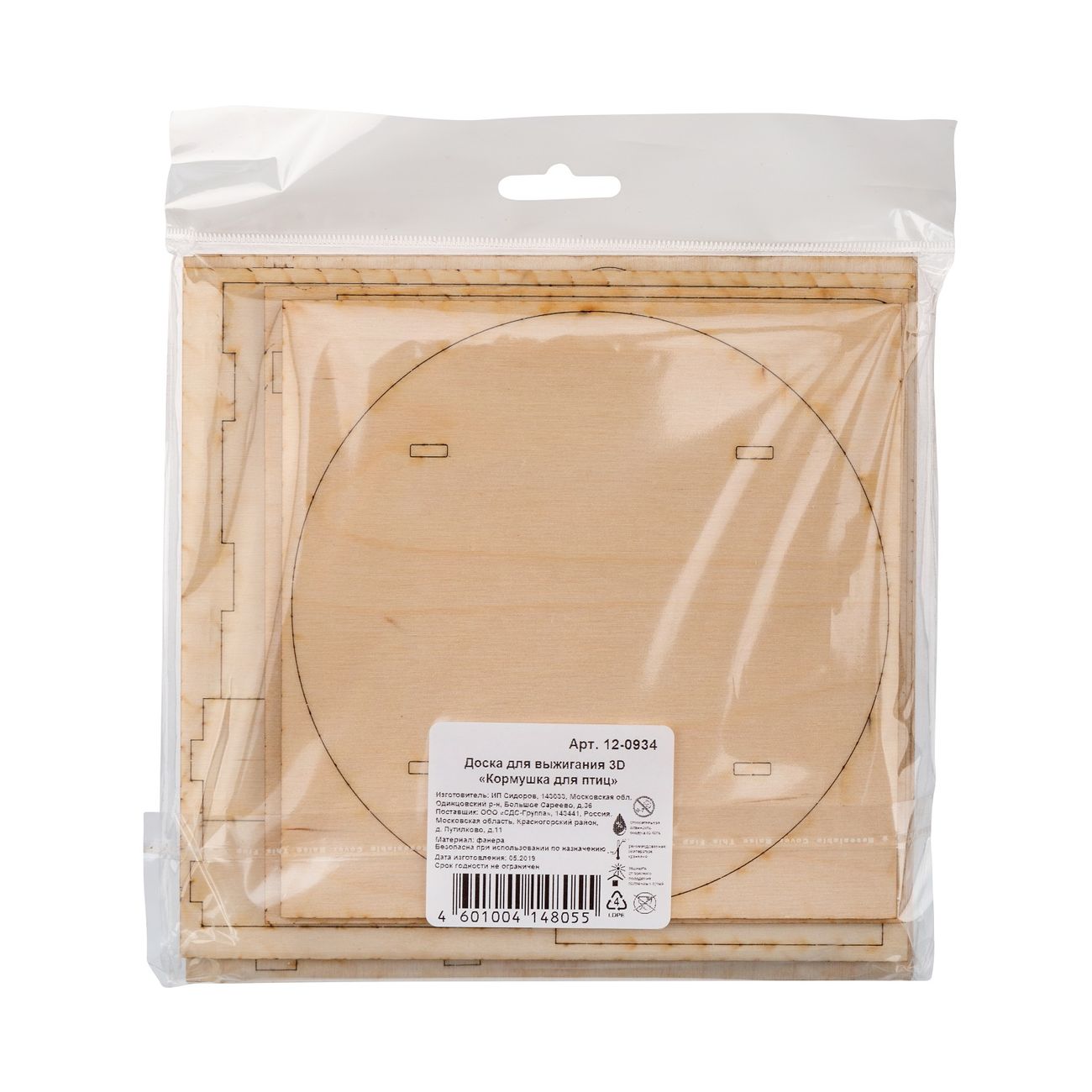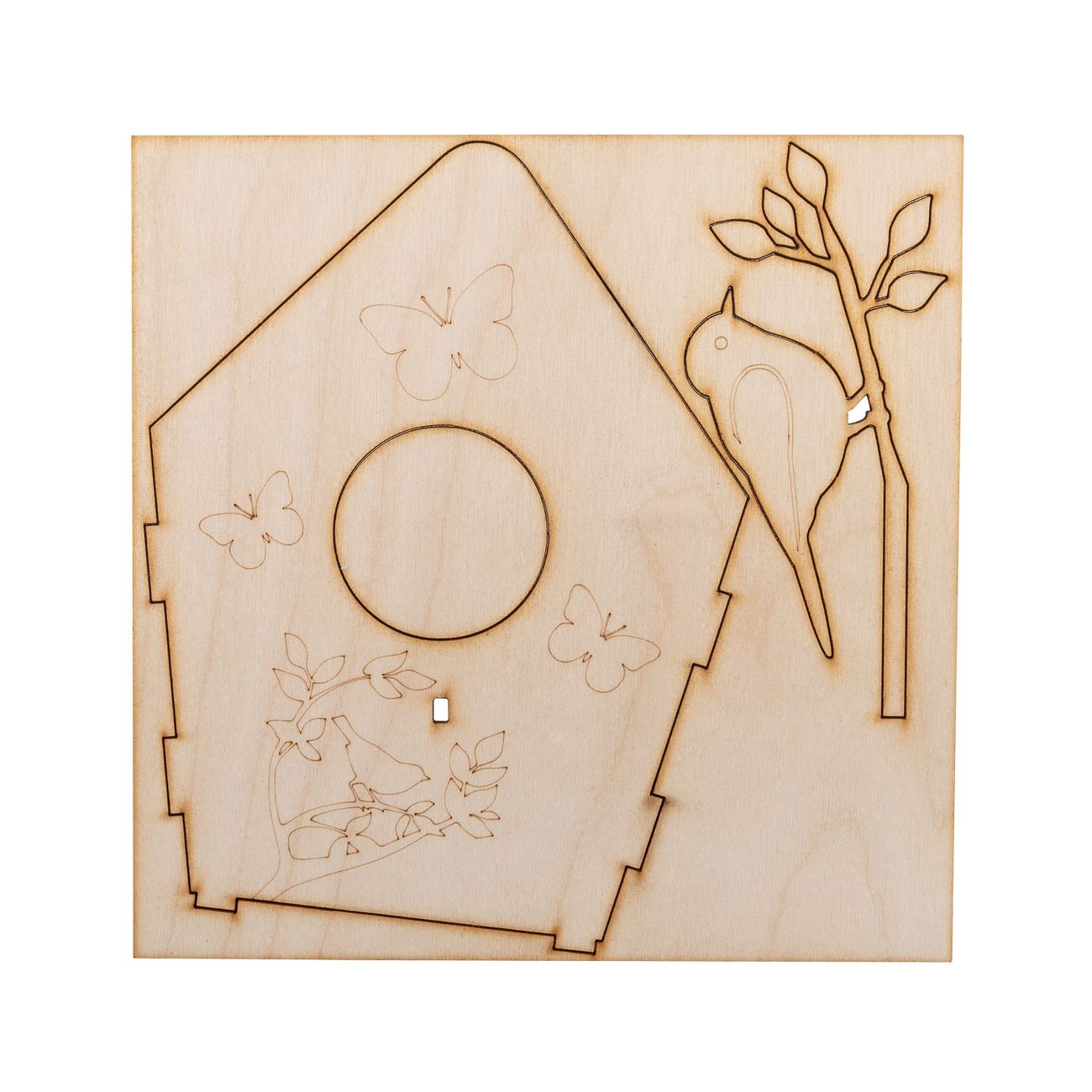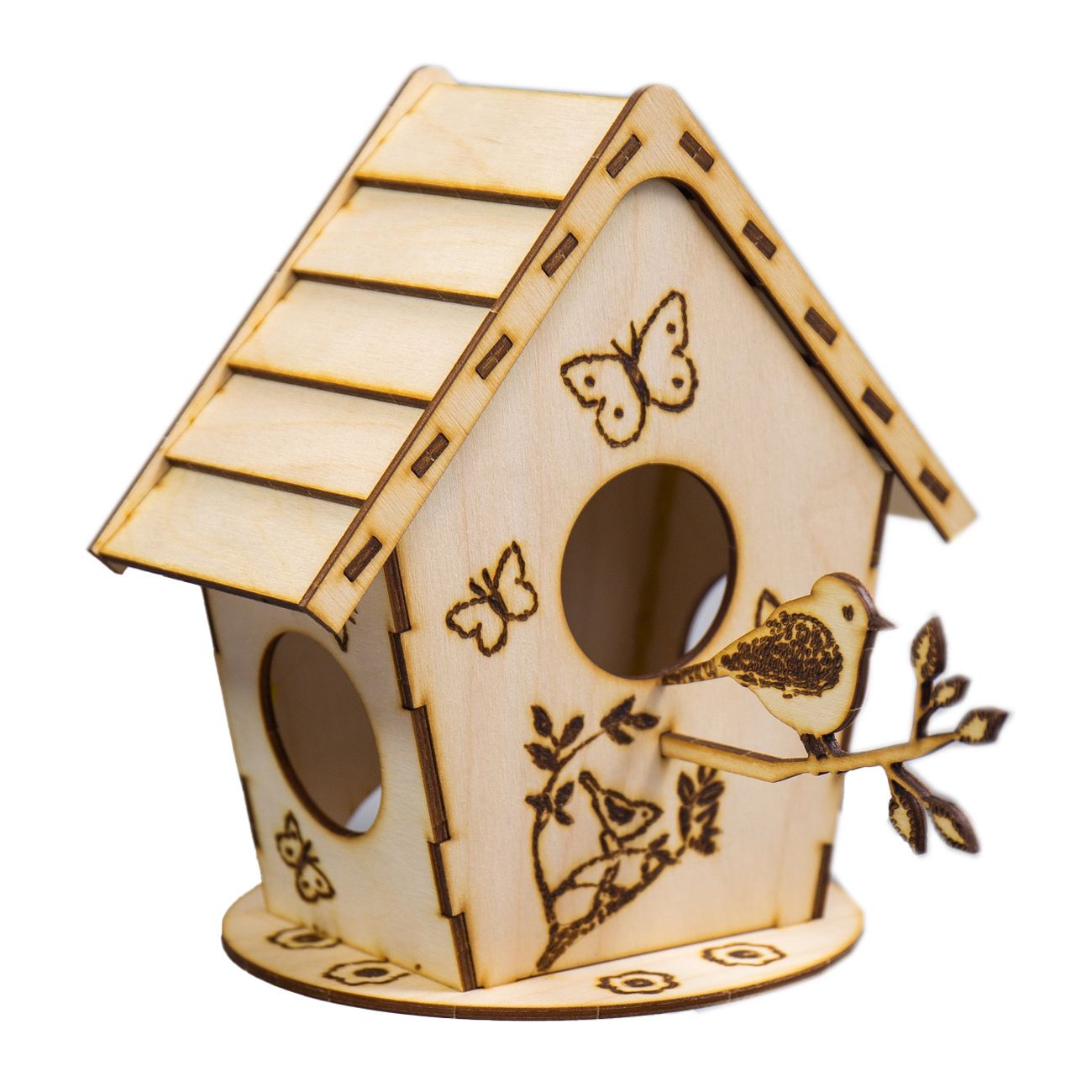 Кормушку украшают разнообразные рисунки, которые нужно выжигать. При желании поделку можно дополнительно раскрасить красками, цветными карандашами или фломастерами. Выжигание тренирует усидчивость, внимательность и мелкую моторику. Набор рекомендуется детям от 8 лет.