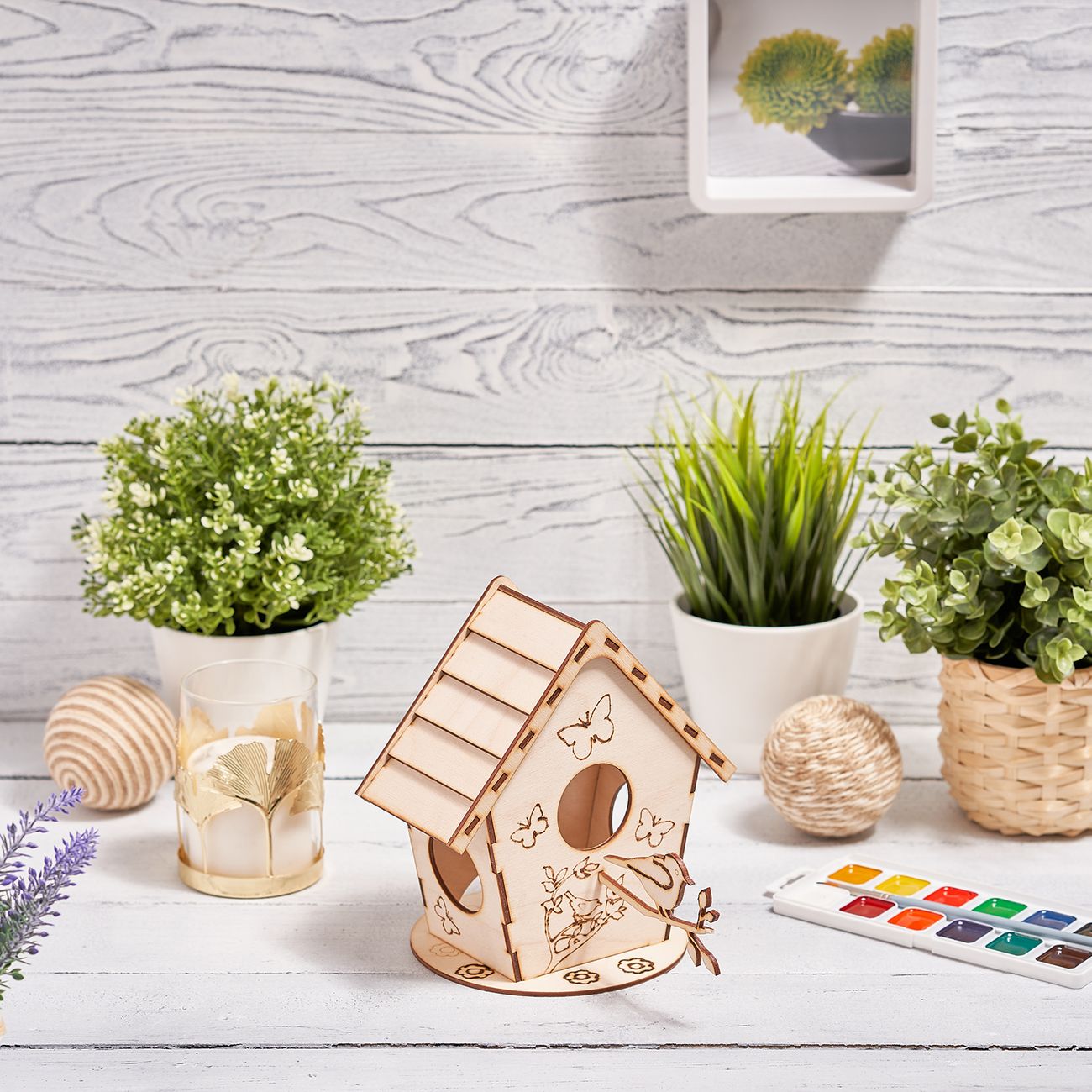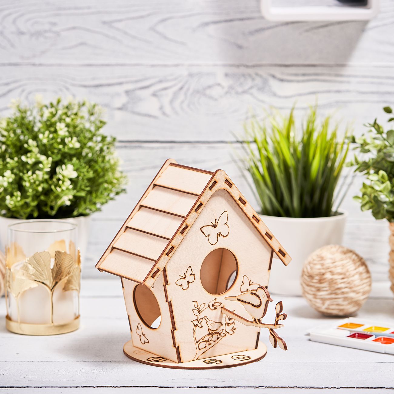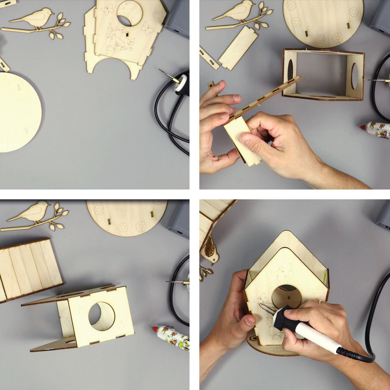 Кормушку украшают разнообразные рисунки, которые нужно выжигать. При желании поделку можно дополнительно раскрасить красками, цветными карандашами или фломастерами. Выжигание тренирует усидчивость, внимательность и мелкую моторику. Набор рекомендуется детям от 8 лет.