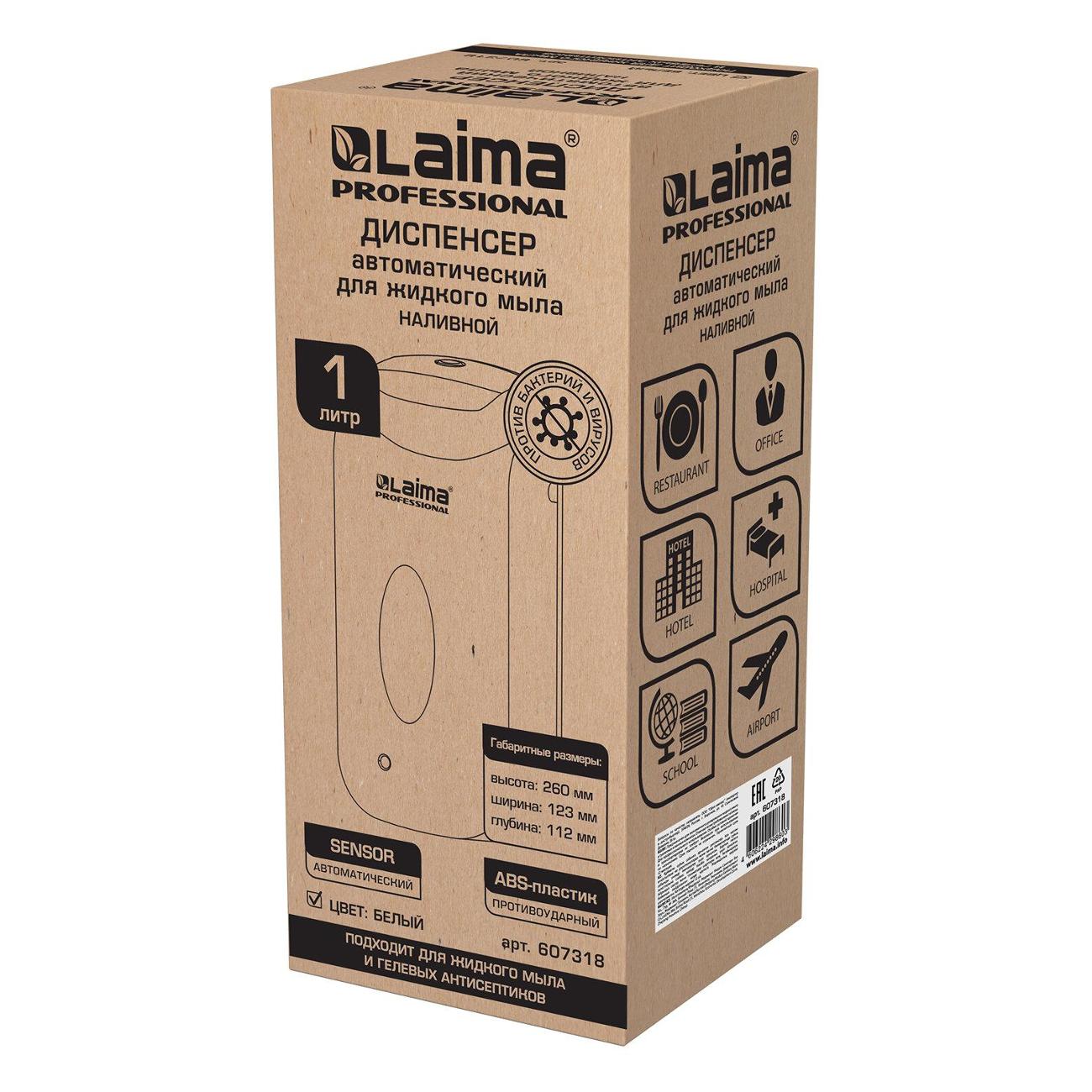 Дозатор для жидкого мыла Laima 607318 крепится к стене, работает от сети и от батареек. В комплект входит блок питания и крепежи. Диспенсер выполнен в пластиковом корпусе белого цвета. Стильный дизайн подойдет для любого интерьера. Габаритные размеры — 26х12,3х11,2 см.