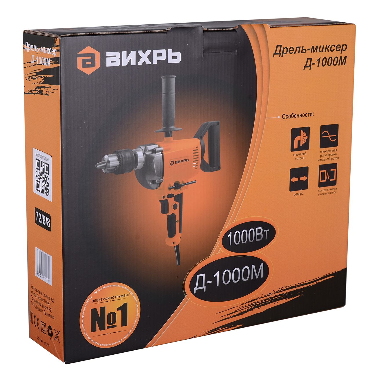 Дрель-миксер «Вихрь» Д-1000М – профессиональный универсальный электроинструмент. С его помощью вы сможете готовить различные строительные и ремонтные смеси и сверлить отверстия в деревянных, металлических, кирпичных и других конструкциях.