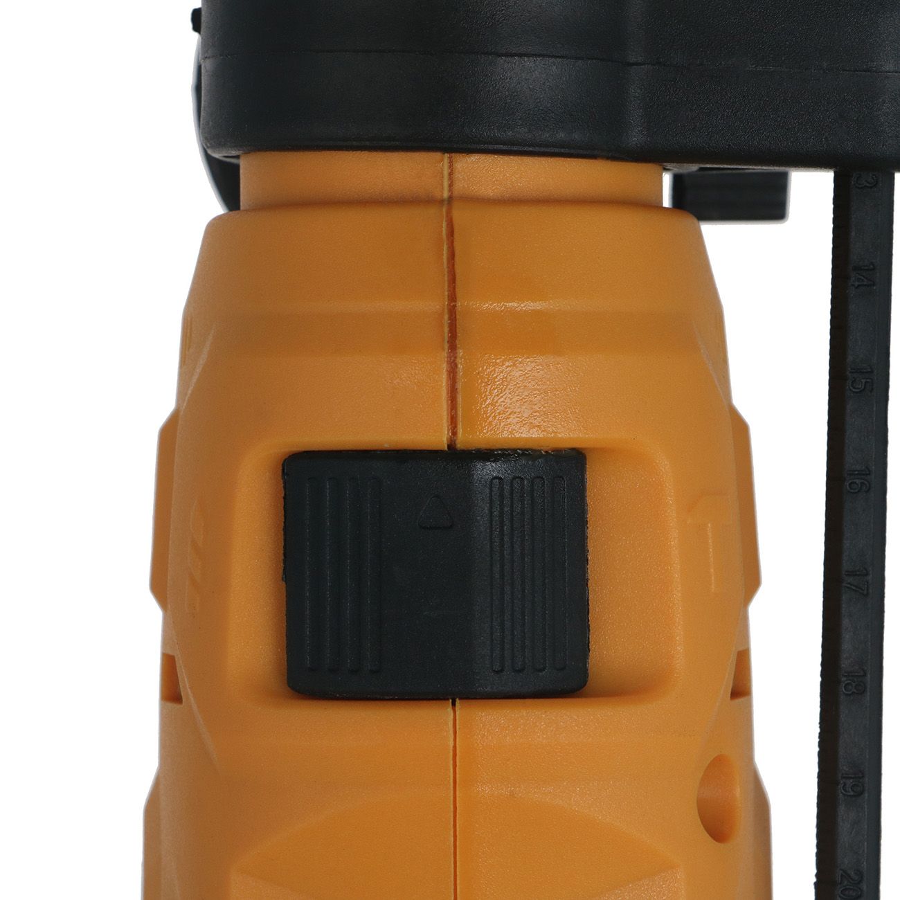 Опция реверса помогает освободить сверло при заклинивании. Прочная рукоять не скользит и удобно ложится в руку. На ней располагается механическая кнопка включения / выключения. Инструмент функционирует от сети напряжением 220-240 В, к которой подключается кабелем длиной 1,8 м.