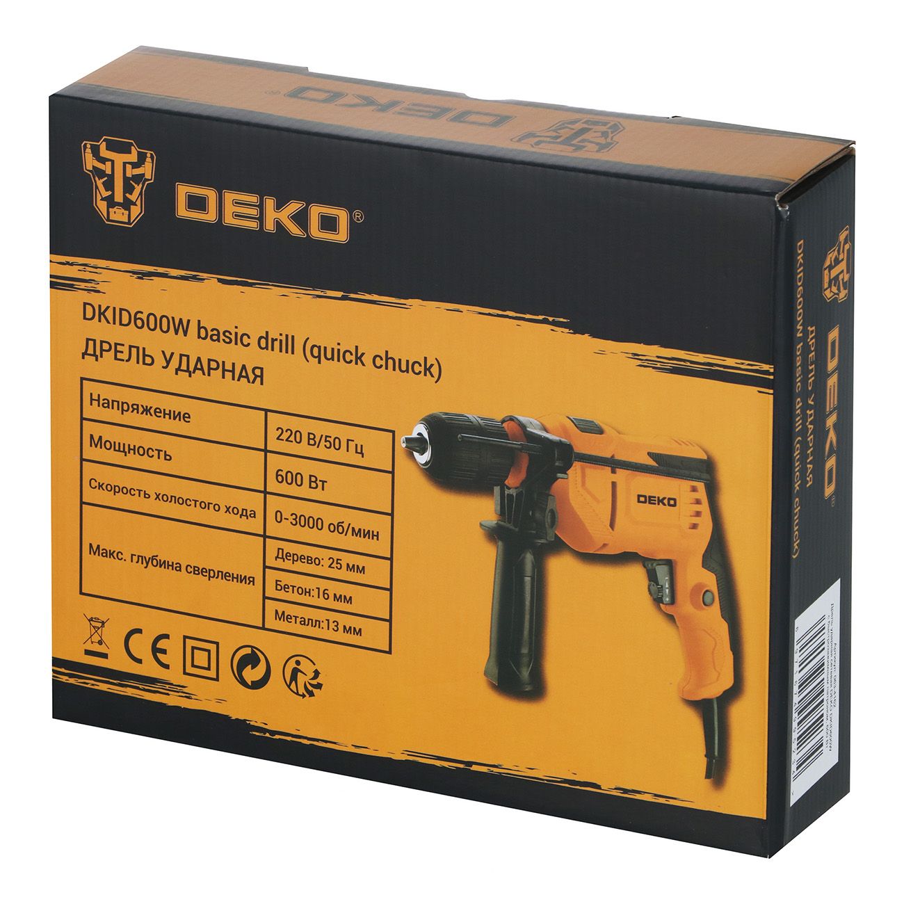 Ударная дрель Deko DKID оборудована быстрозажимным патроном, поэтому можно менять оснастку максимально быстро. Устройство мощностью 600 Вт дает возможность сверлить отверстия в разнообразных материалах — древесине, гипсе, металле, кирпиче, бетонных плитах и конструкциях при ремонтных и строительных работах.