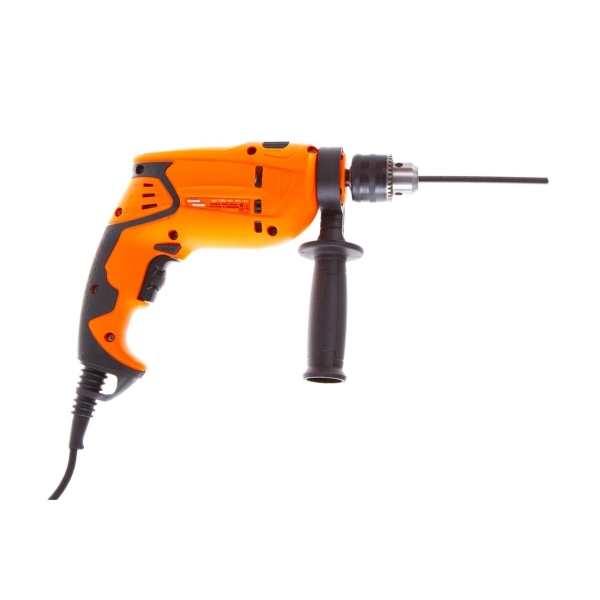 Инструмент с коллекторным двигателем сделан из пластика. Путём нажатия клавиши вам доступно переключение режима работы со сверления на сверление с ударом и наоборот. Максимальная нагрузка – 2800 об/мин. Обрезиненная ручка позволяет делать крепкий захват. При необходимости её положение можно менять.