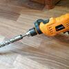 Для безопасности и получения качественного результата модель снабжена ограничителем глубины сверления. Корпус изготовлен из пластика. Прорезиненная ручка не скользит в руке, обеспечивая надежный захват и максимальный контроль над инструментом. Дополнительная рукоятка входит в комплект. Питание — от сети. Потребляемая мощность составляет 500 Вт. Корпус изготовлен из пластика и окрашен в желтый и черный цвета. Размеры инструмента составляют 25х10х30 см, вес — 1,7 кг.