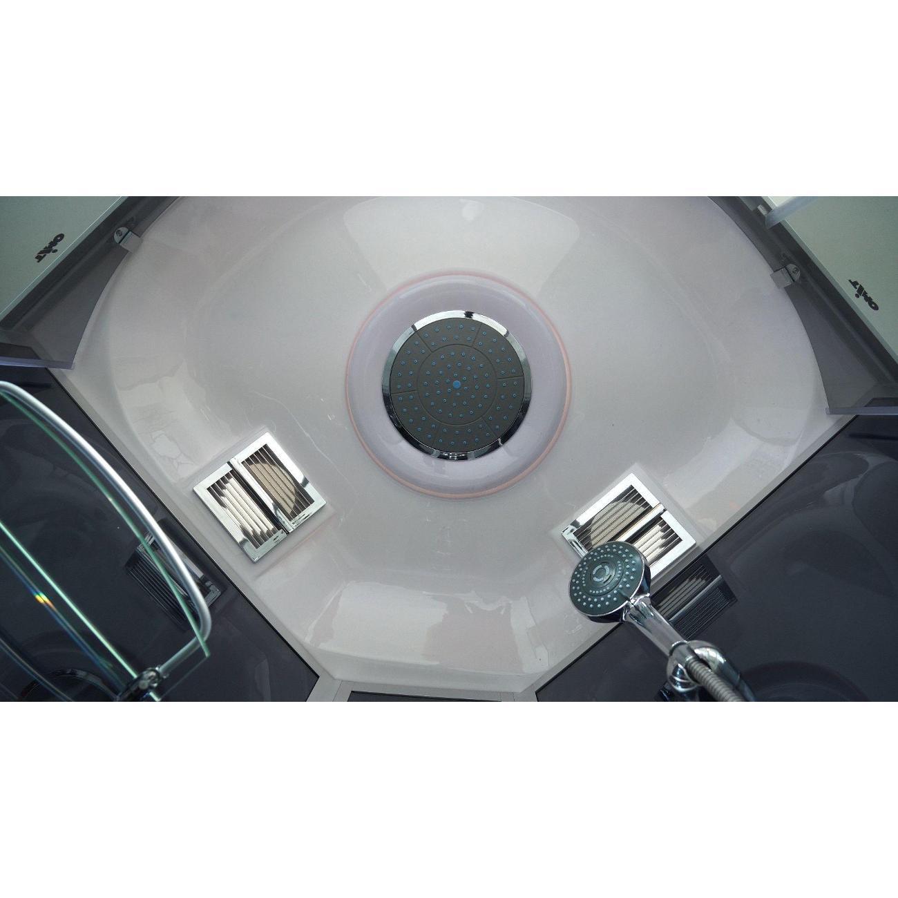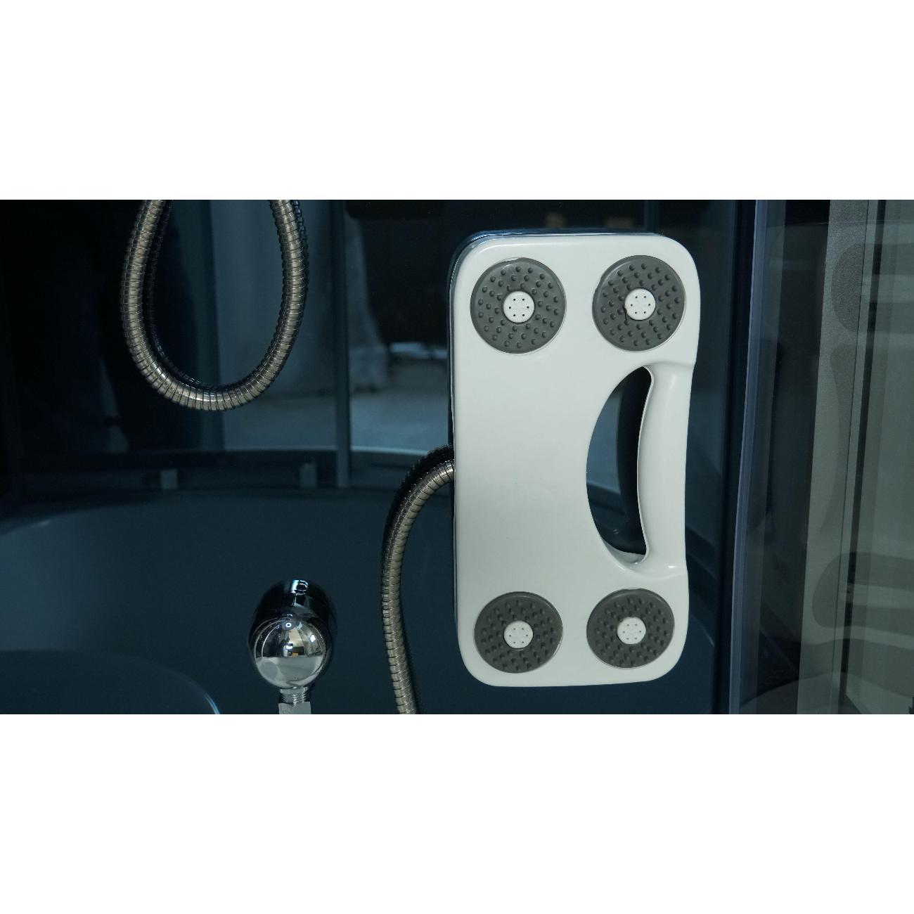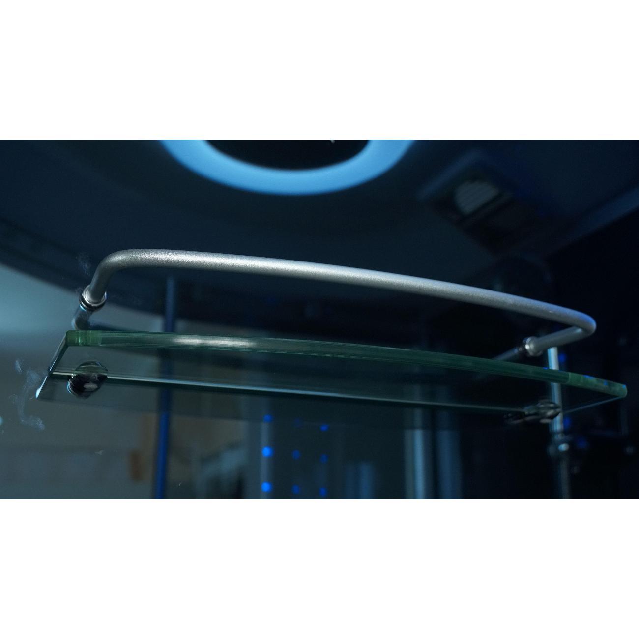 душевая кабина, сенсорная панель управления, FM радио; стеклянная полочка; электр. вентиляция; подсветка (возможна комплектация в двух вариантах, интегрированная в троп.душ или отдельная, в зависимости от поставки); смеситель; сидение с огр.по весу 50 кг; гидромассаж спины (6 джет); ручная лейка на держателе.