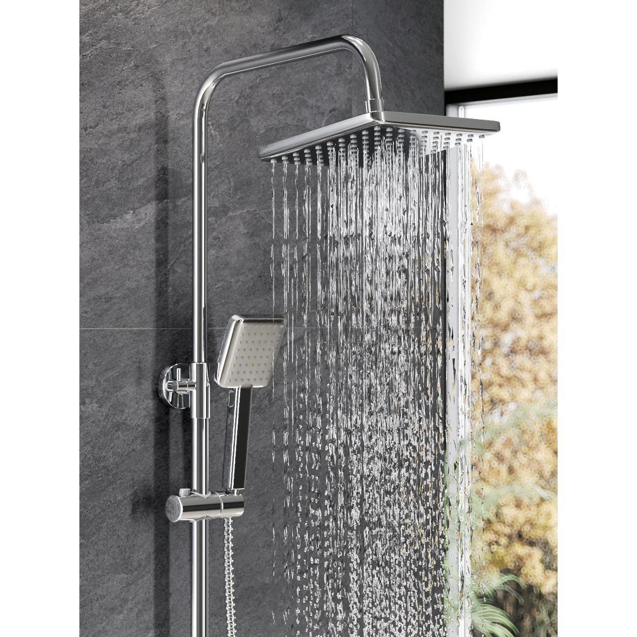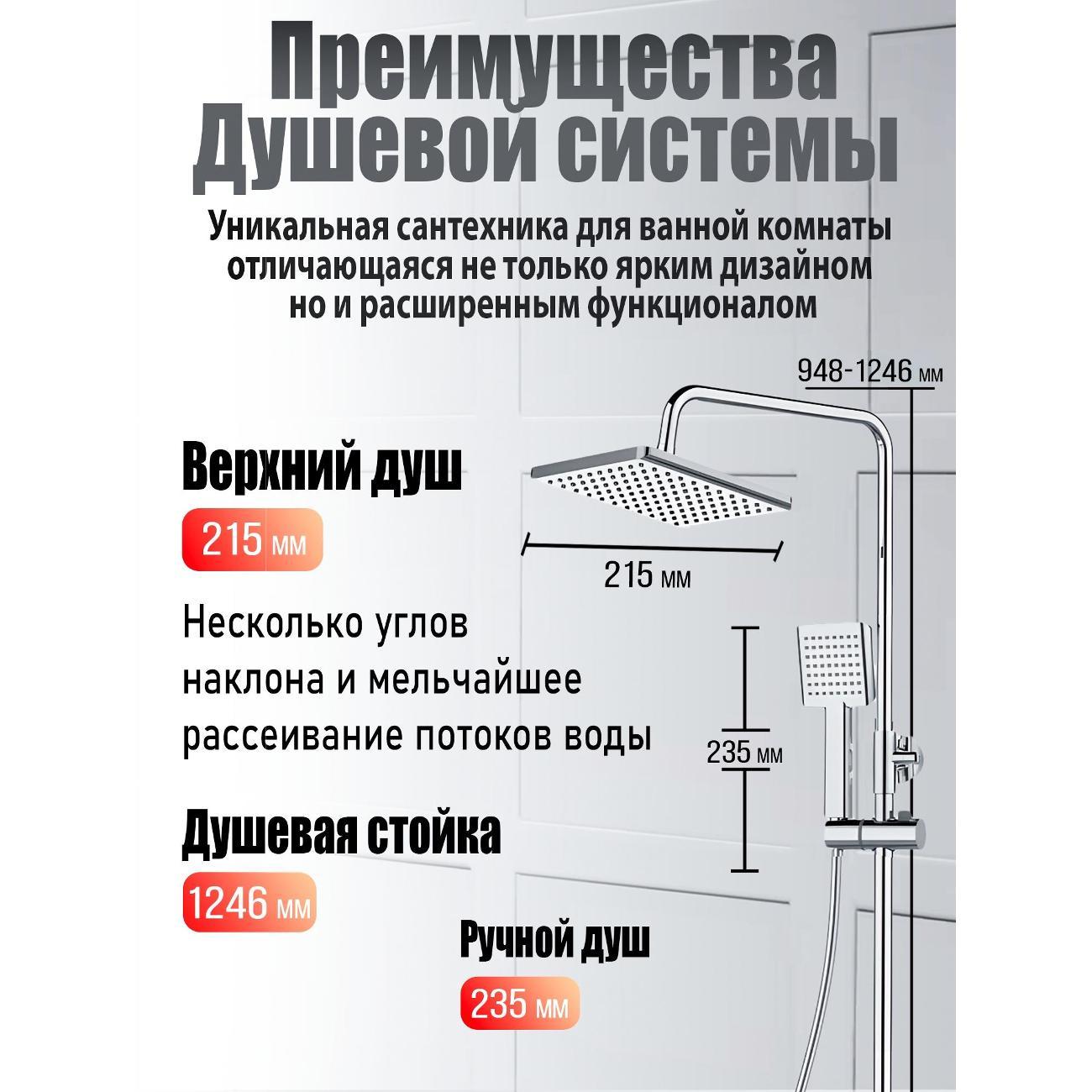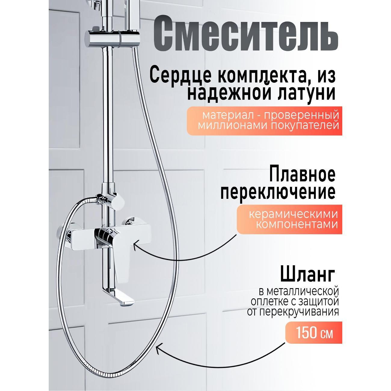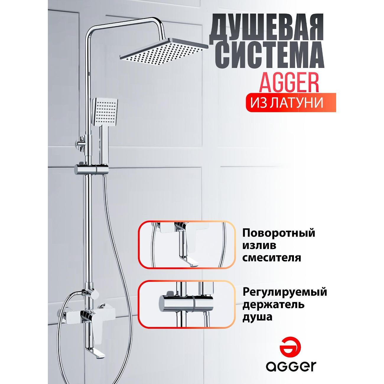 Душевая система Agger Brilliant прекрасно дополнит интерьер ванной комнаты в современном стиле: поворотный излив (16,4 см), телескопическая штанга, верхний душ 215х215 мм с регулировкой угла наклона и силиконовыми наконечниками (с защитой от известкового налета), ручной душ 95х100 мм (1 режим), регулируемый по высоте и наклону держатель ручного душа, шланг 150 см с защитой от перекручивания (в металлической оплетке), смеситель с керамическим картриджем (переключение на душ - поворотом излива). Цвет глянцевый хром.