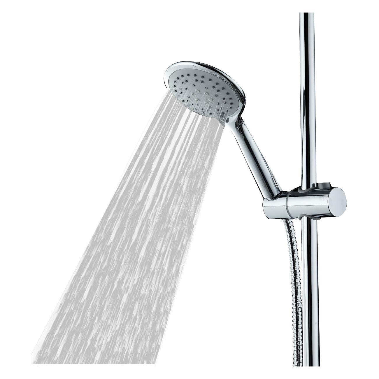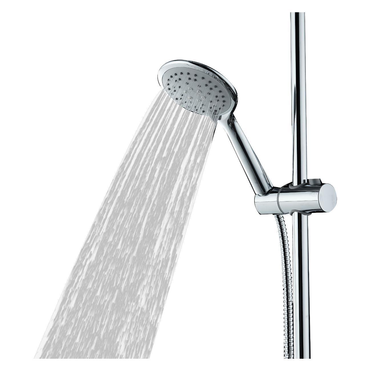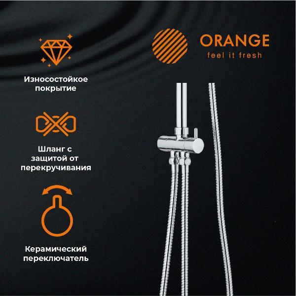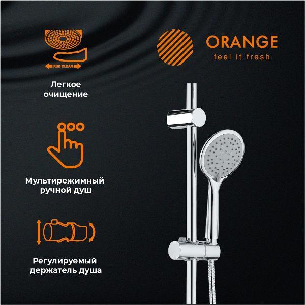 Душевая система Orange S05cr в цвете глянцевый хром: верхний душ (d230 мм) создаёт эффект тропического дождя, что дарит непередаваемые эмоции во время ежедневных банных процедур. Ручной душ d110 мм (3 режима) на гибком полутораметровом шланге (в металлической оплетке) с защитой от перекручивания. Держатели верхнего и ручного душа с регулировкой угла наклона, штанга 970 мм с подвижным держателем (возможность установки в старые отверстия). В комплекте также переключатель потоков и пластиковая мыльница. Подвижные детали отличаются долговечностью. Форсунки верхнего и ручного душа с функцией легкого очищения от известкового налета.