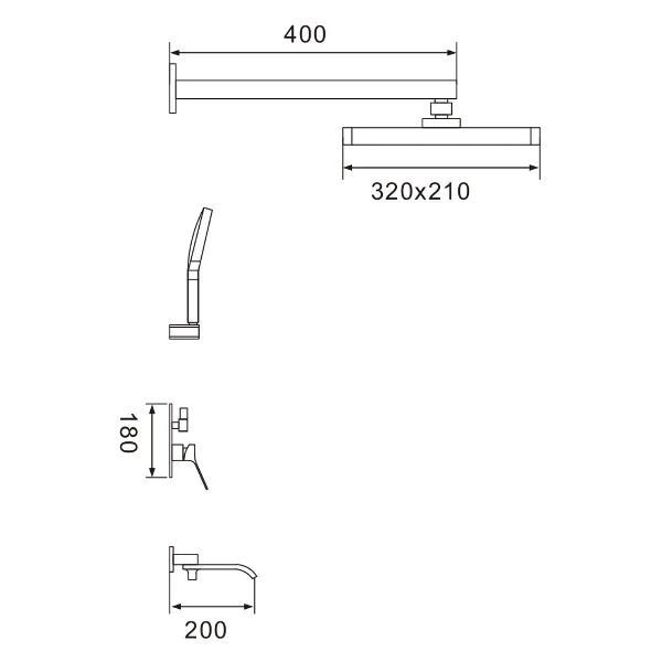 Верхний душ прямоугольной формы размером 320х210 мм выполнен из ABS-пластика с силиконовыми форсунками, которые легко очищаются от известкового налета. Верхний душ крепится к настенному кронштейну длиной 40 см через шарнир, позволяющий поворачивать его по всей оси для удобства использования.