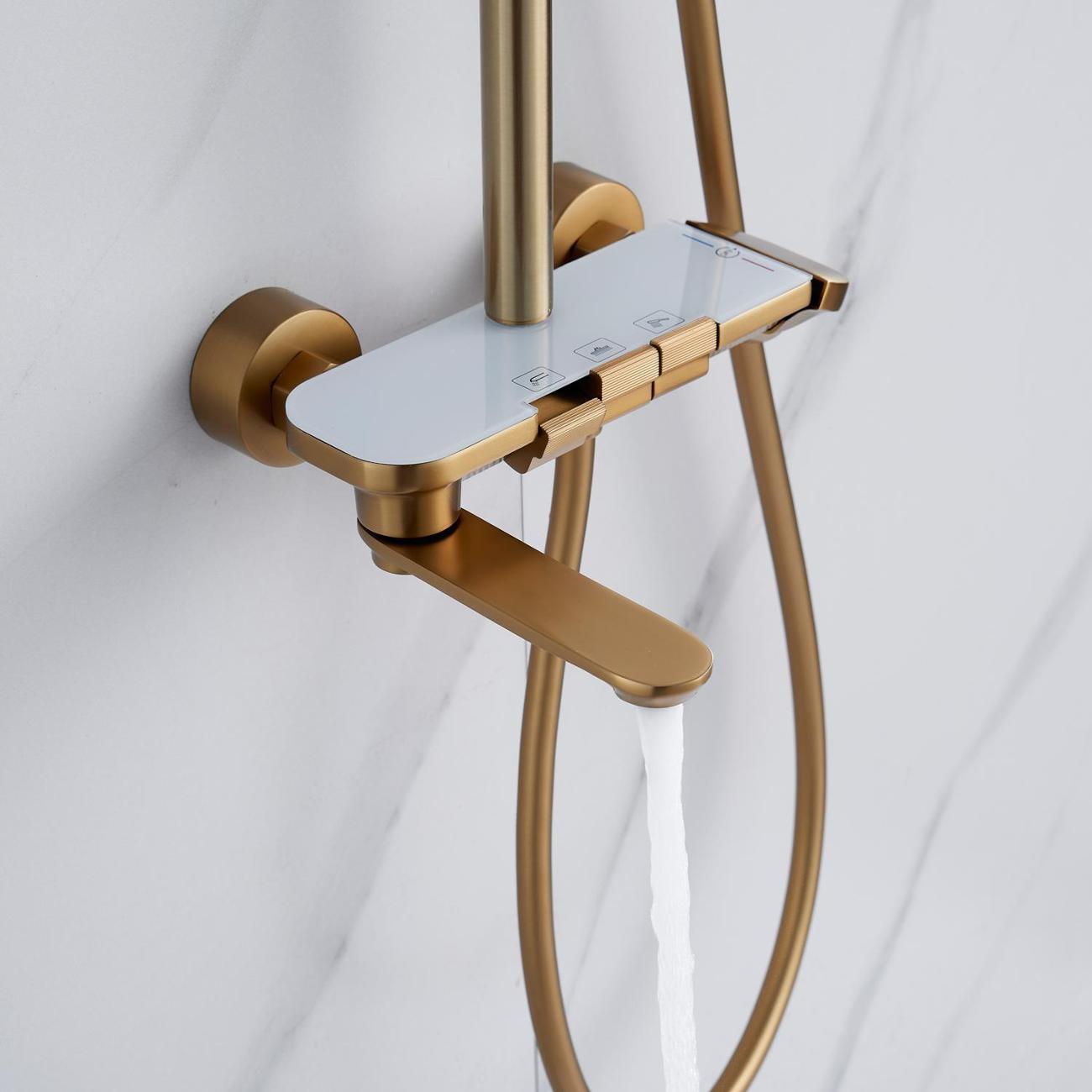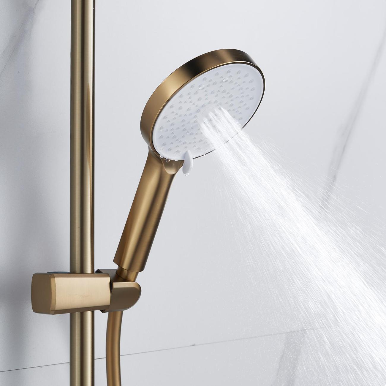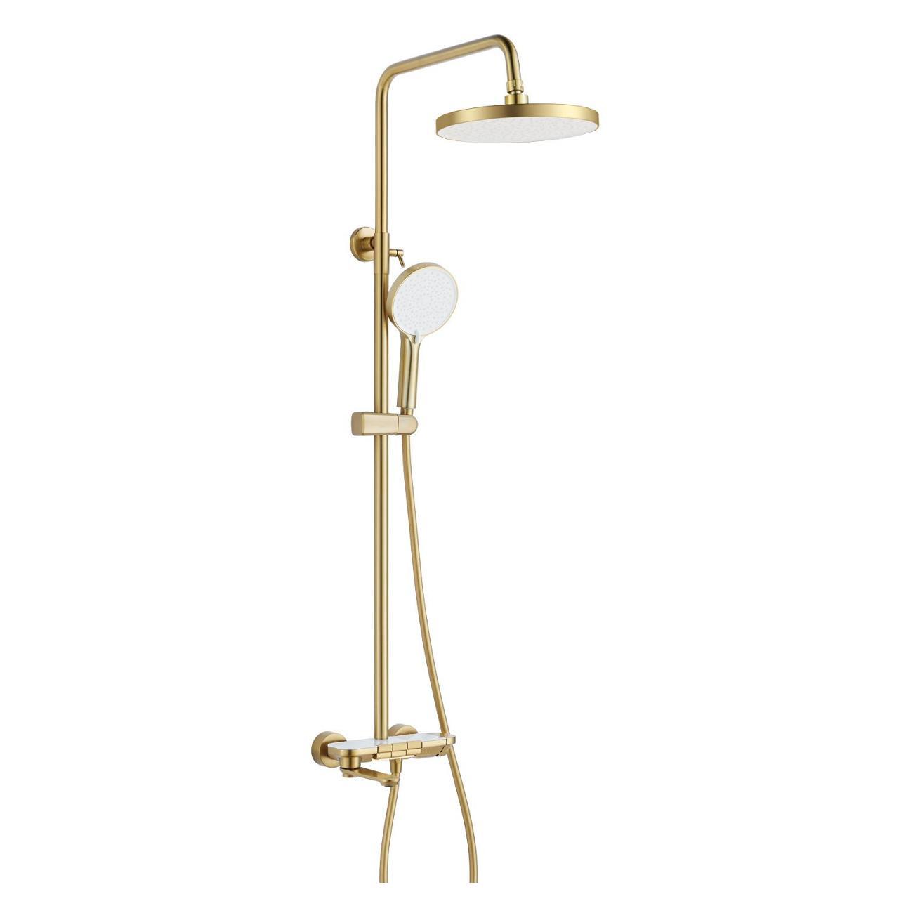 Элегантная душевая система Shevanik S4726G в цвете "золотой сатин" (сатинированное золото) воплощает в себе современный дизайн и безупречное качество исполнения. Изготовленная из прочной латуни, она гарантирует долговечность и надежность в использовании.