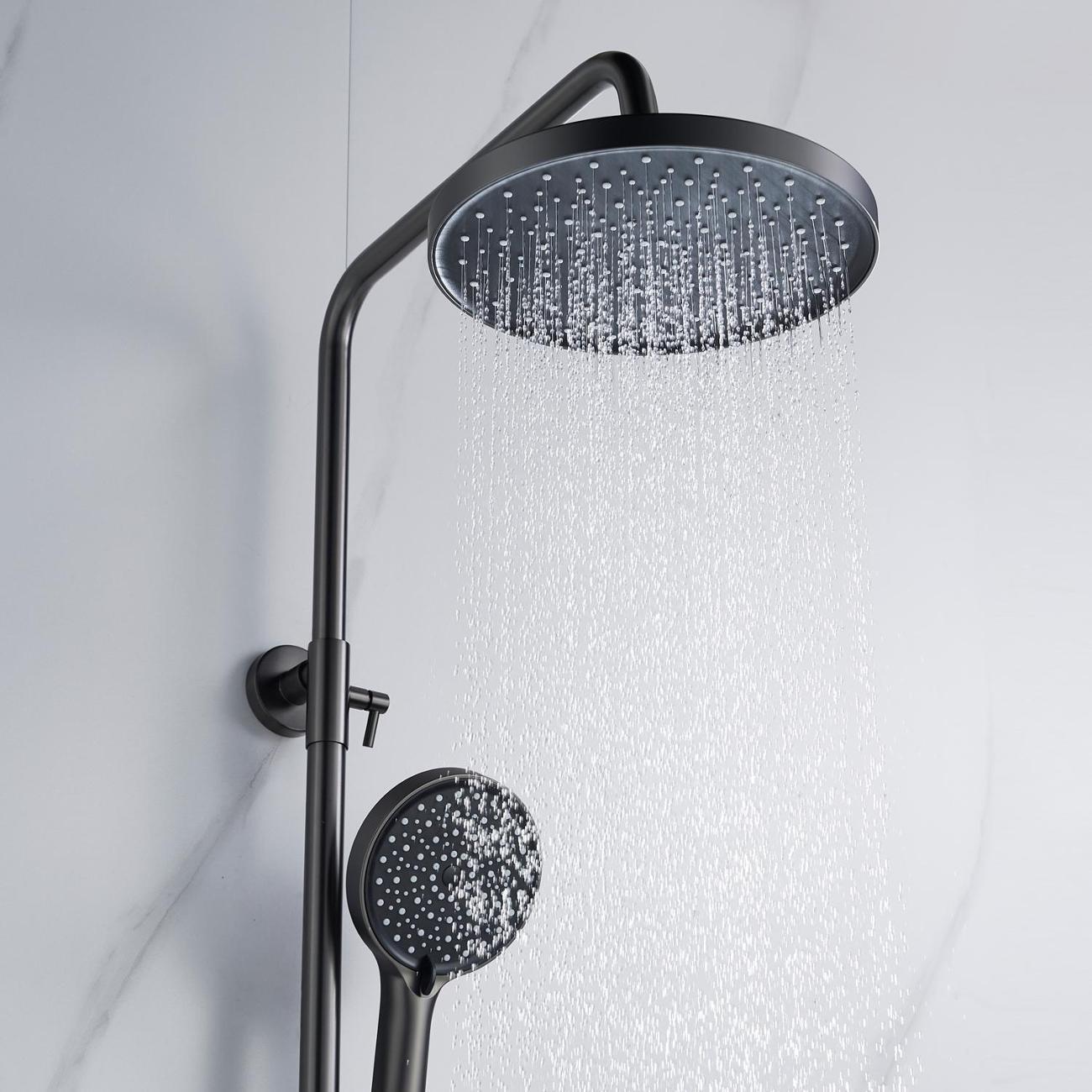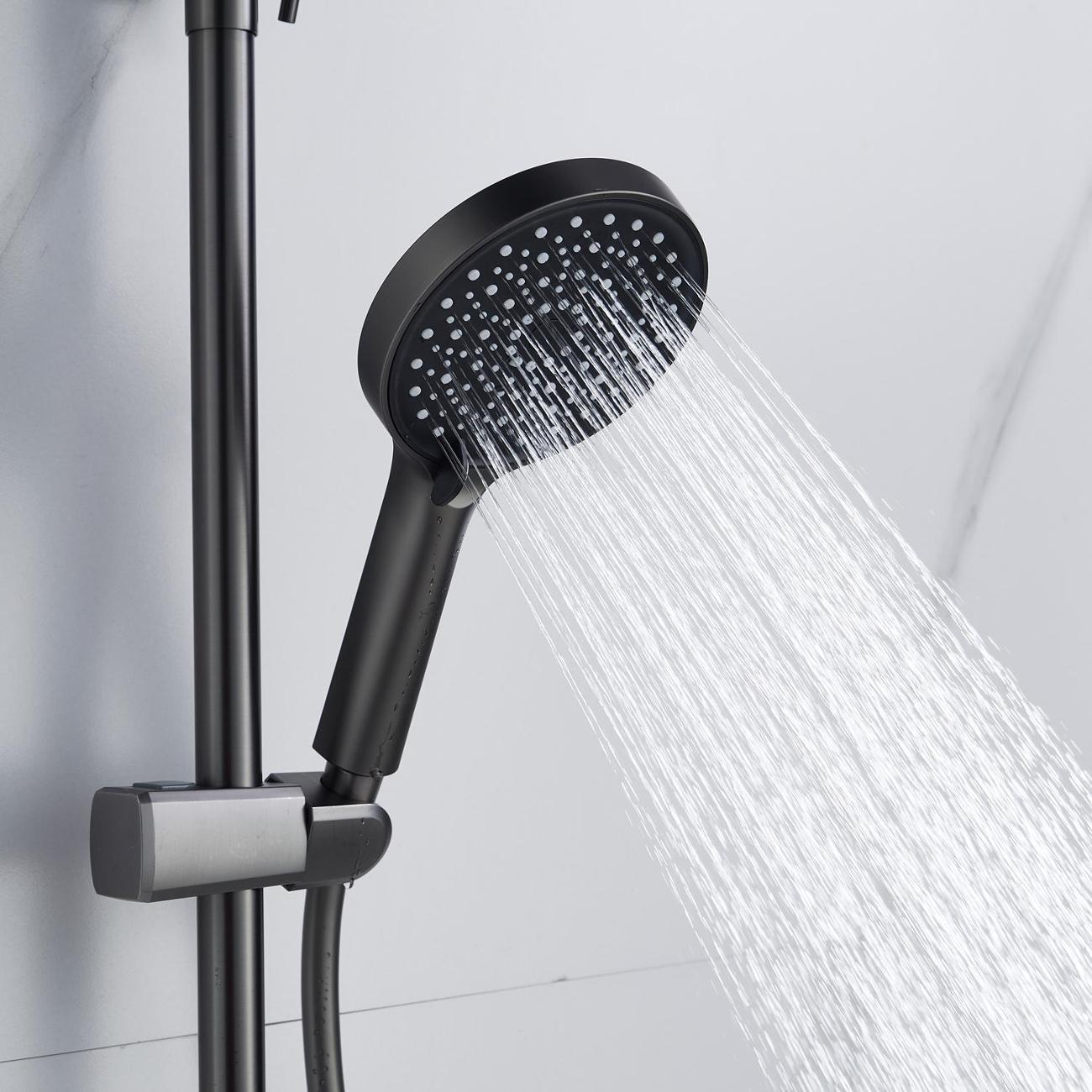 Система оснащена просторным верхним душем диаметром 250 мм с силиконовыми форсунками, которые легко очищаются от известкового налета. Благодаря встроенному шарниру, угол наклона верхнего душа можно регулировать вдоль всей оси. Душевая лейка с 3 режимами струи также имеет силиконовые форсунки и устанавливается на универсальном держателе, позволяющем настраивать положение как по высоте, так и по наклону.