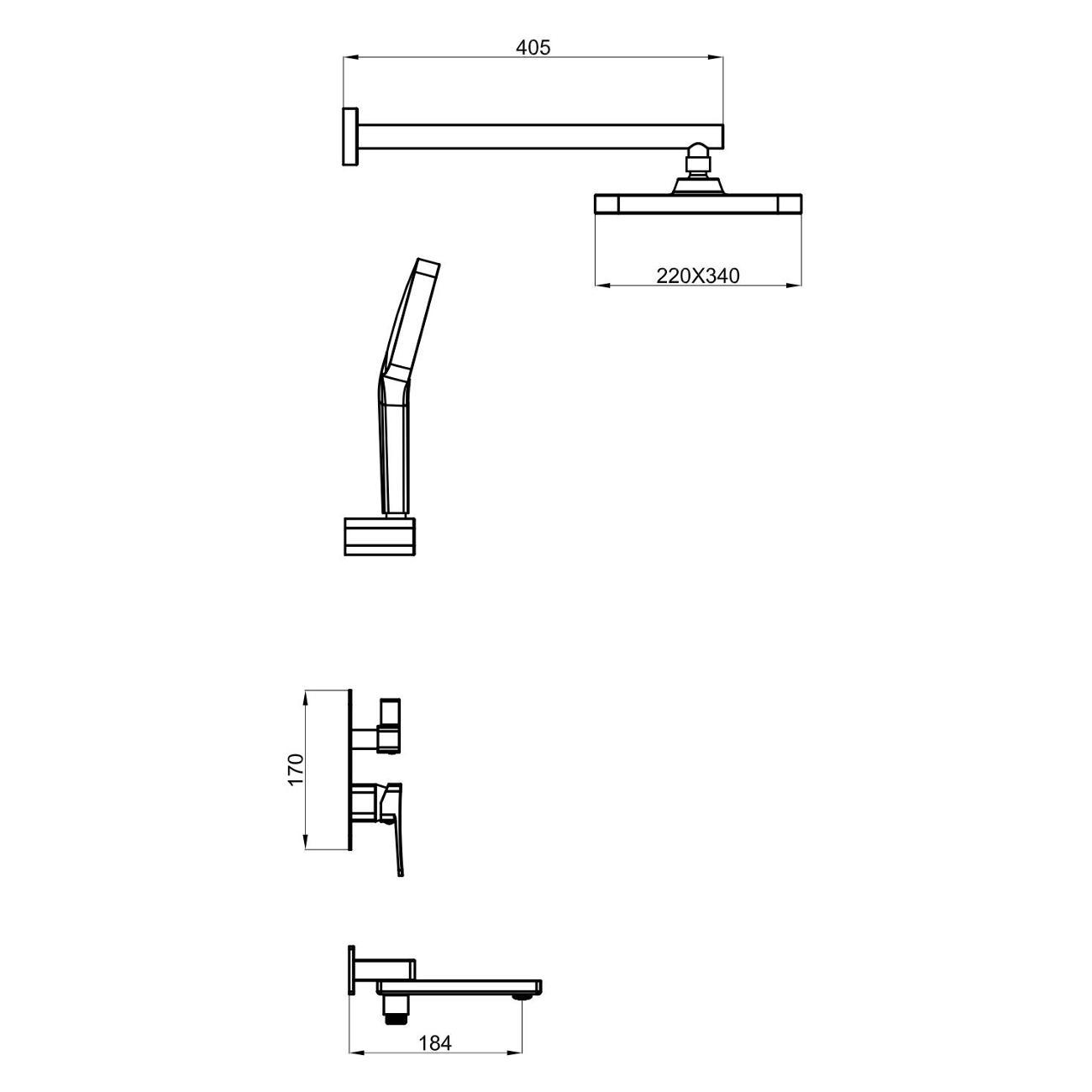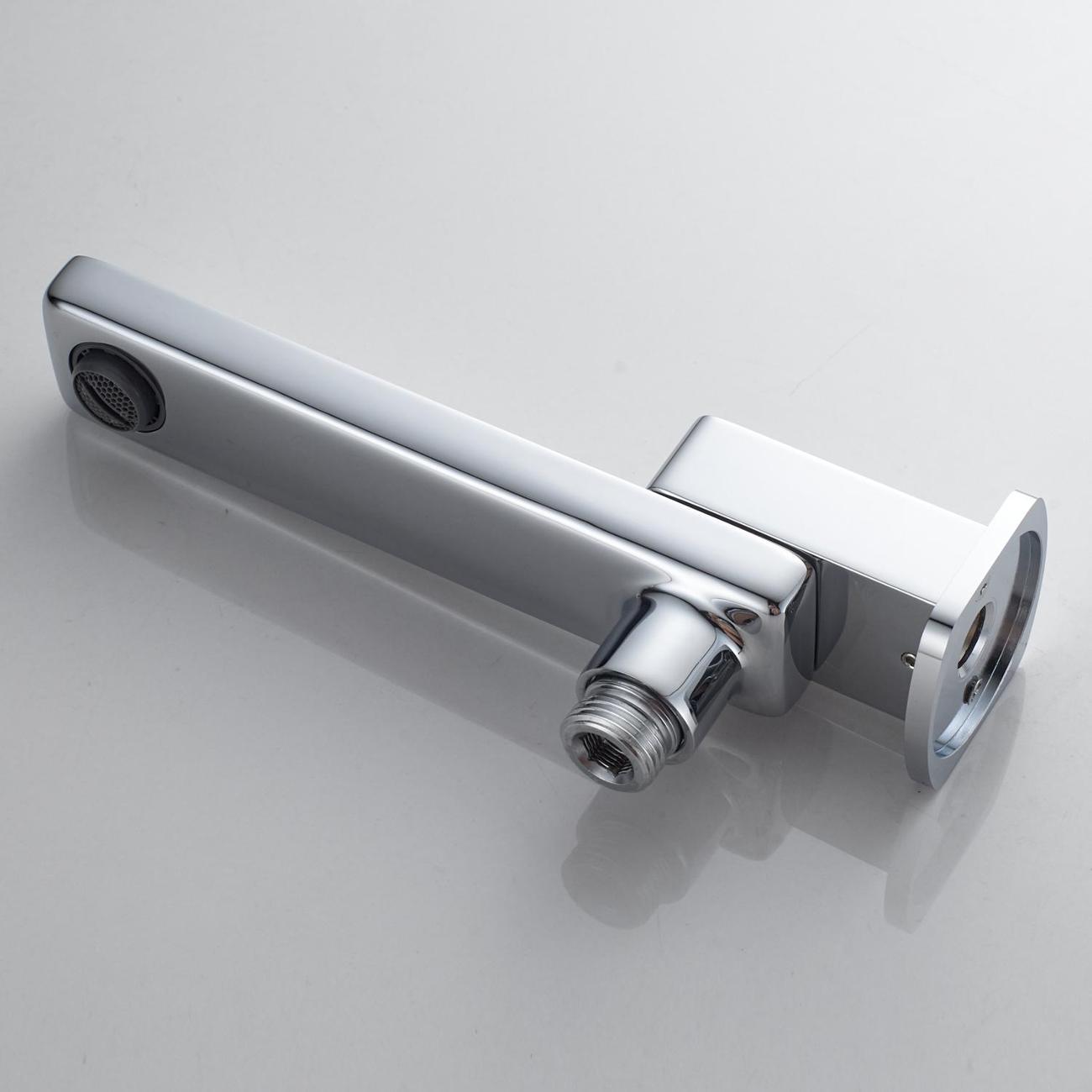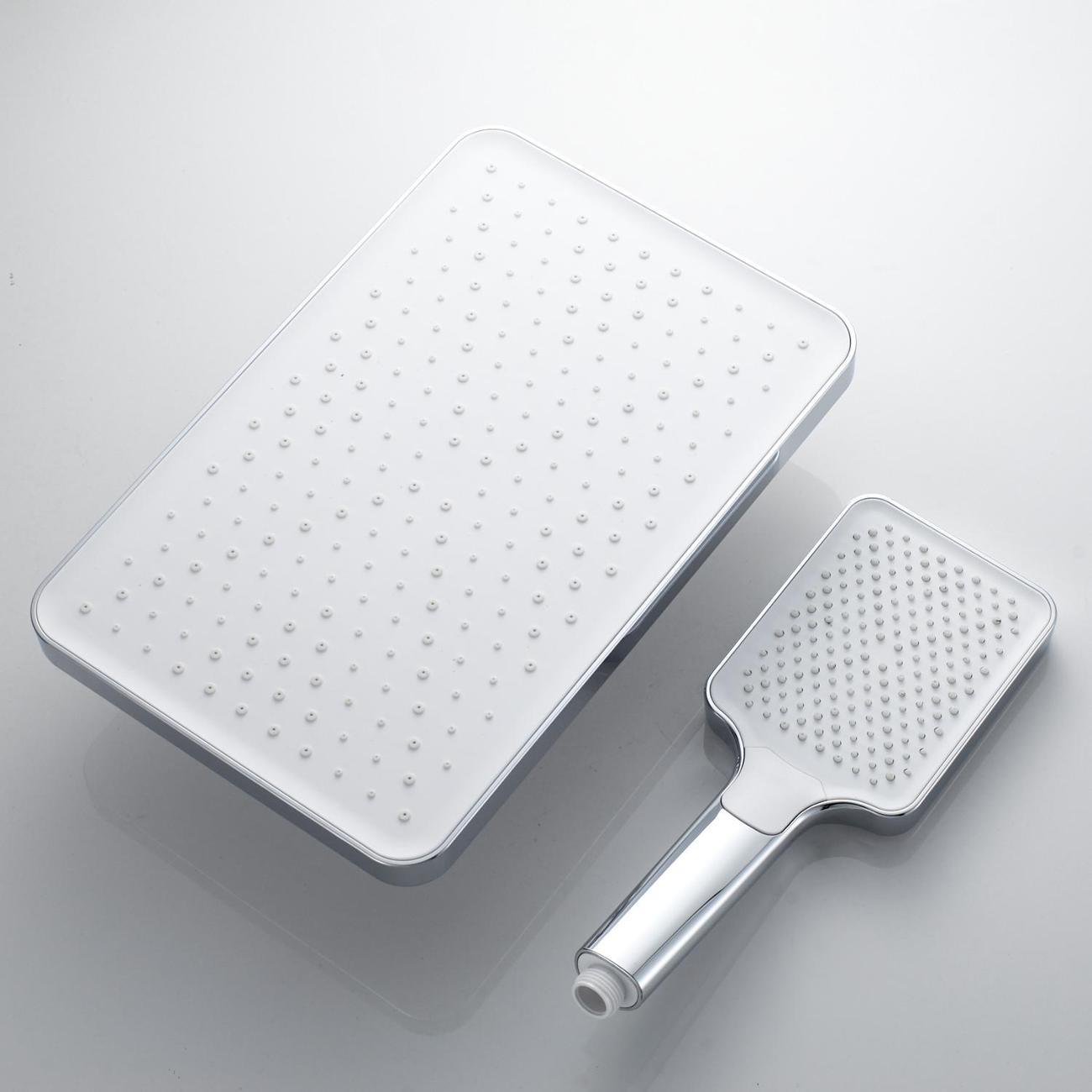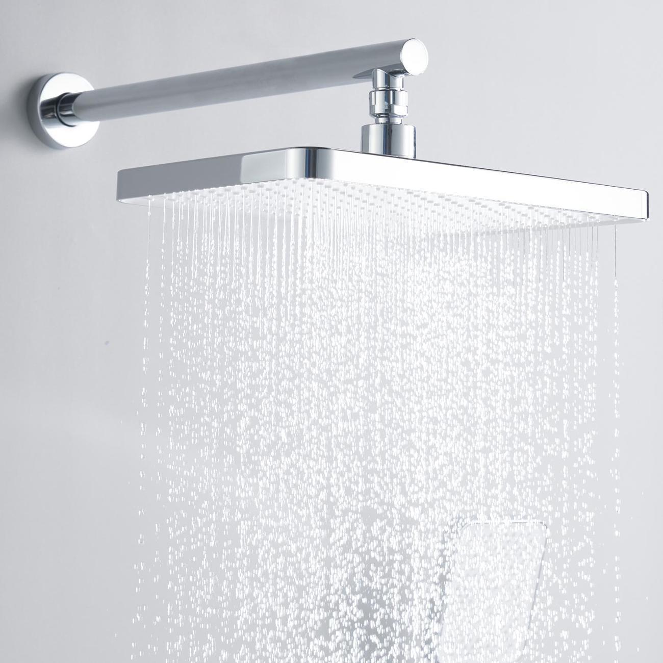 Верхний душ прямоугольной формы (340 × 220 мм) изготовлен из качественного ABS‑пластика и оснащён силиконовыми форсунками. Такие форсунки не только обеспечивают приятный водный поток, но и легко очищаются от известкового налёта. Душ крепится к настенному кронштейну длиной 40 см через шарнирное соединение, благодаря чему его можно поворачивать по всей оси, настраивая под индивидуальные предпочтения.